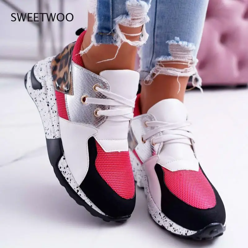 Женские кроссовки 2021, Женская Вулканизированная обувь на шнуровке с леопардовым принтом, спортивные женские кроссовки на платформе, дышащая женская обувь плюс