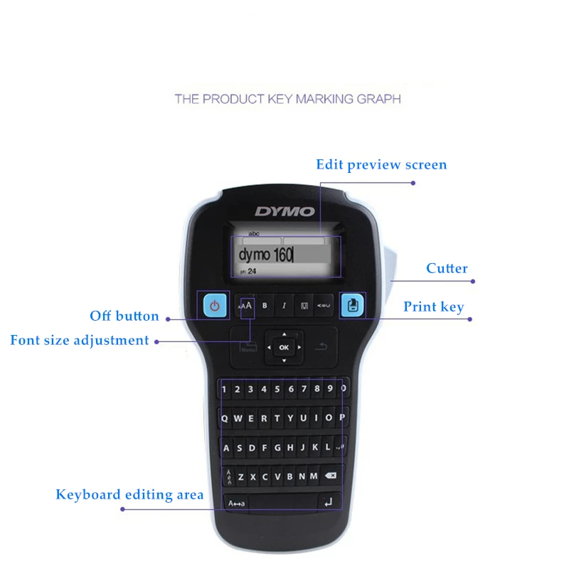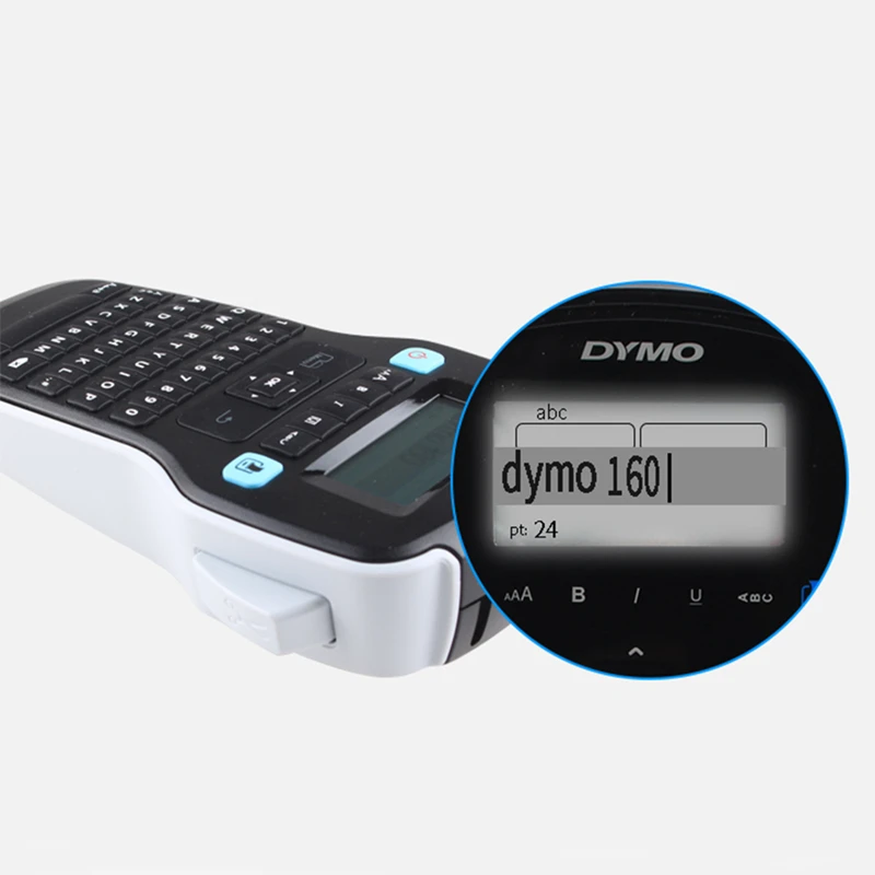 Номер модели: Dymo LM160 принтер этикеток Размер: 162*64*155 мм Подходит Ленточные стикеры: Dymo D1 6/9/12 мм ленты Вес: 812 г (без батареи и ленты) Подключение компьютера: нет Память: может хранить 9 этикеток