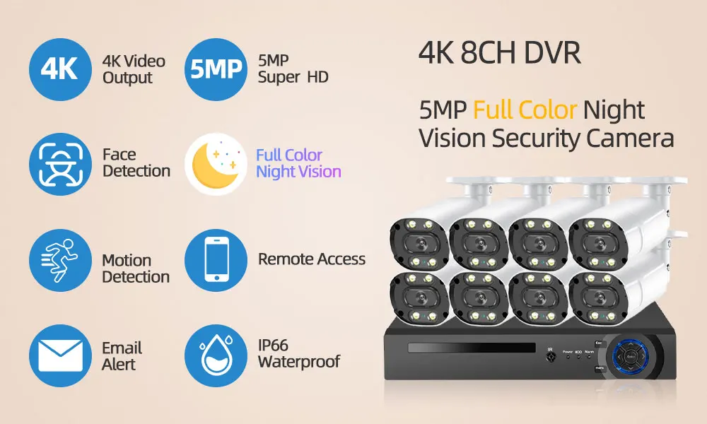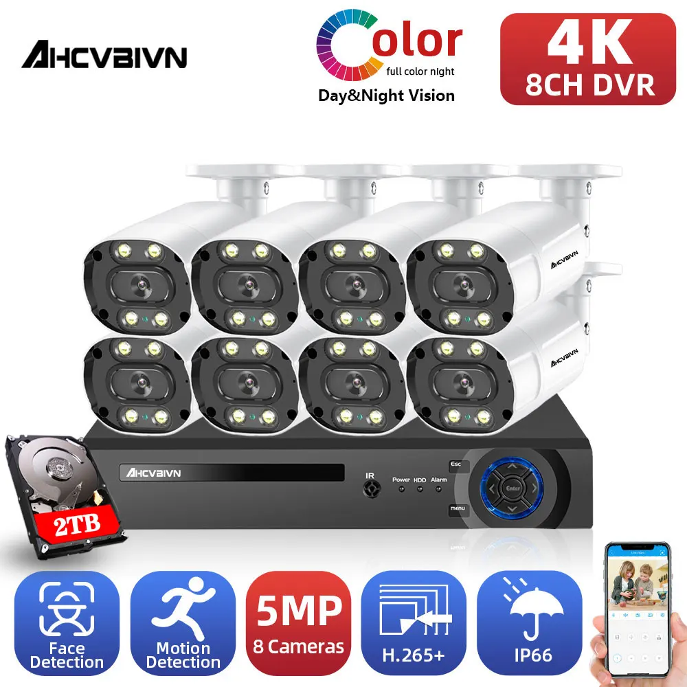 8CH DVR рекордер 4K комплект с 5MP красочным ночным видением Обнаружение движения IP66 AHD камера наружного наблюдения камера Xmeye
