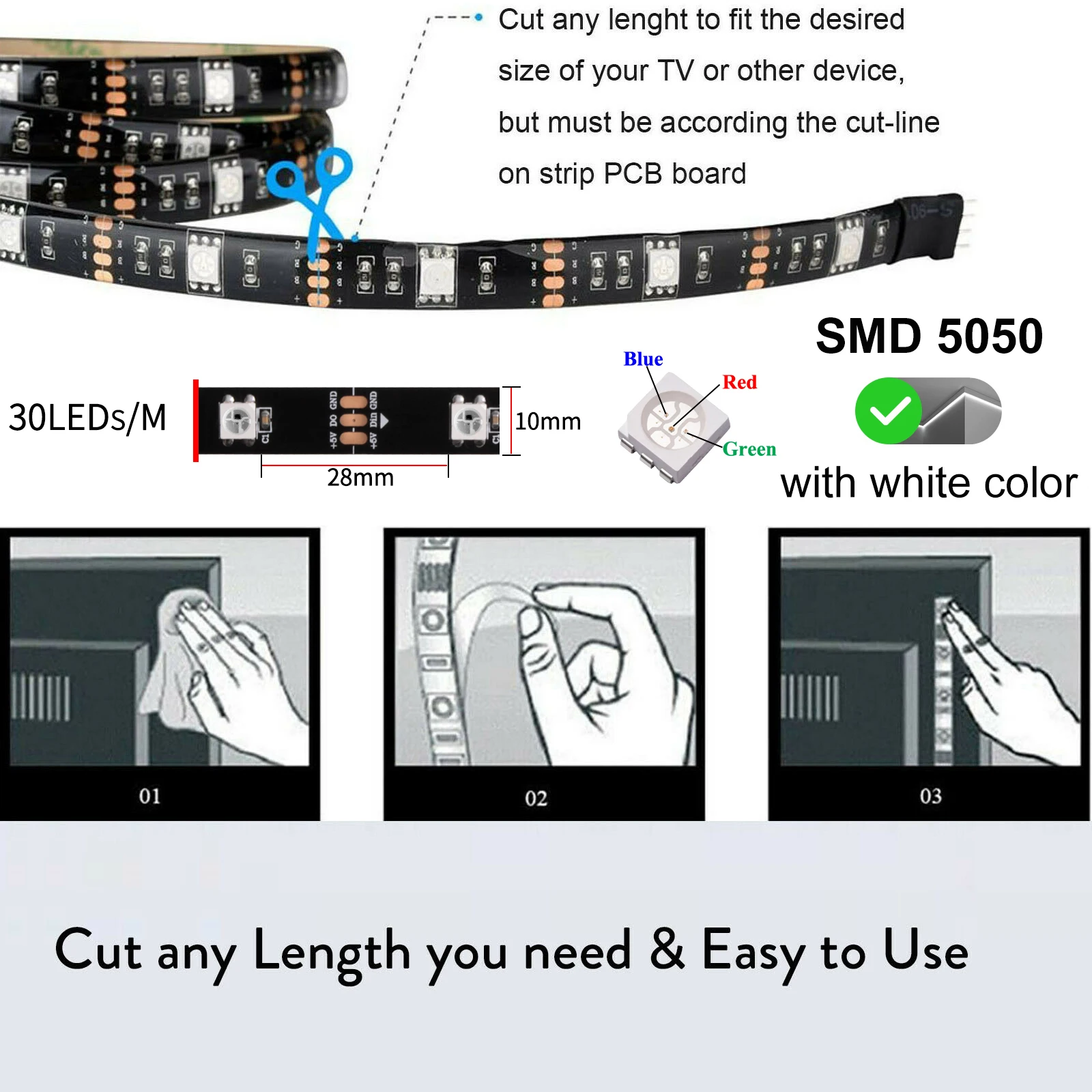 1. Проверьте, правильно ли работает продукт first2, очистите и высушите установочный плаце3, гибкие соединительные шнуры и сделайте ленту легко сгибаться в corner4, работает с usb-портом tv, зарядным устройством для телефона, И внешний аккумулятор с выходом 5v 1a5 загрузите приложение, чтобы наслаждаться разными цветами на задней панели телевизора