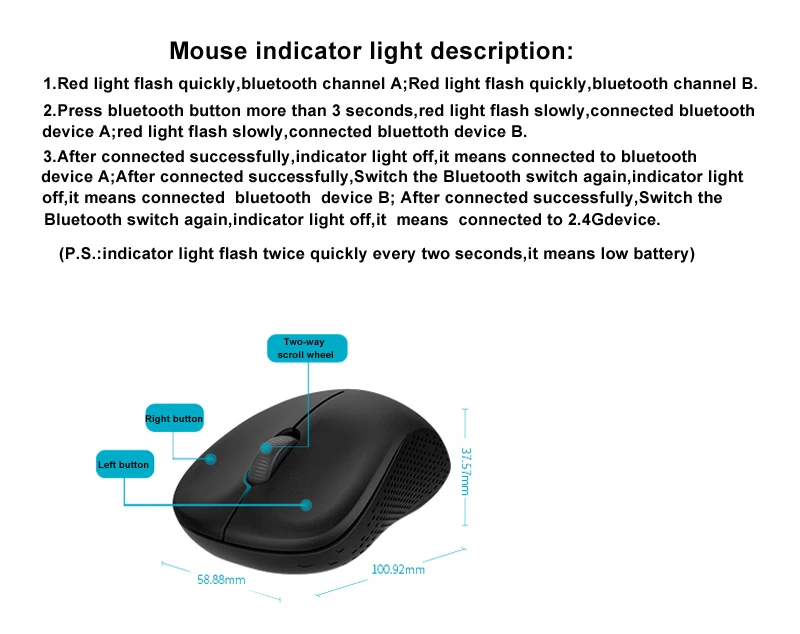 Модель 2,4G1. Подключите приемник Rapoo.2. Включите мышь или клавиатуру.Совместимая с Bluetooth модельКлавиатура1. Нажмите и удерживайте комбинации клавиш, Fn + 1,Fn + 2 или Fn + 3 по крайней мере секунды для сопряжения 3 различных устройств через BT3.0/4,0.Соответствующий синий, зеленый и голубой светодиодный индикатор состояния медленно мигает. Клавиатура обнаруживается в течение 60 секунд.2. Полное сопряжение с Bluetooth на вашем устройстве. Когда клавиатура и ваше устройство сопряжены, светодиодный индикатор состояния выключается.Мышь1. Включите мышь2. Нажмите кнопку переключения, чтобы выбрать канал, на котором подключено ваше устройство.Соответствующий зеленый и синий светодиодный индикатор быстро мигает.3. Нажмите и удерживайте кнопку переключения, по крайней мере, 3 секунды для сопряжения. Соответствующий зеленый и синий светодиодный индикатор состояния медленно мигает.Мышь обнаруживается в течение 2 минут.4. Полное сопряжение с Bluetooth на вашем устройстве. Когда мышь и ваше устройство сопряжены, светильник выключается.Сопряжение по Bluetooth:Windows 7 и 8:(1) Нажмите кнопку «Пуск», затем выберите Панель управления> Добавить устройство.(2) Выберите клавиатуру или мышь из списка.(3) нажмите Далее и следуйте любым другим инструкциям, которые могут появиться на экране.Windows 10:(1) Нажмите кнопку «Пуск», затем выберите Настройки> устройства> Совместимость с Bluetooth.(2) Выберите клавиатуру или мышь из списка.(3) Нажмите на пару и следуйте любым другим инструкциям, которые могут появиться на экране.* Мышь Rapoo BT3.0 KB/Rapoo BLE KB/Rapoo BT3.0/Rapoo Ble MouseСостояние светодиодный:КлавиатураСветодиодный индикатор состояния медленно мигает, показывая, что клавиатура и ваше устройство сопряжены с помощью BT3.0/4,0.МышьКогда вы берете мышь, если светильник становится стабильным зеленым в течение 6 секунд, совместимое с Bluetooth устройство 1 сопряжено.Если светильник в течение 6 секунд становится стабильным синим, устройство Bluetooth 2 сопряжено.Если светильник выключен, 2,4 ГГц устройство работает в паре.Когда вы переключитесь в устройство, которое подключается через 2,4 GHz приемник, светильник выключается.При переключении на устройство, подключенное через Bluetooth, зеленый или синий светильник быстро мигает.Переключение между парными устройствамиНажмите комбинацию клавиш клавиатуры, Fn + 1,Fn + 2,Fn + 3 и Fn + 4 для переключения между парными устройствами.Нажмите кнопку переключения мыши для переключения между парными устройствами.Клавиатура и мышь подключить устройство через 2,4 GHz приемник. Они соответственно пара 3 и 2 устройства через Bluetooth-Совместимость с операционными.Низкая батареяКогда вы используете клавиатуру или мышь, если светодиодный индикатор состояния мигает дважды каждые две секунды, это означает, что мощность аккумулятора сейчас низкая.Системные требованияWindows XP/Visa/7/8/10 или более поздняя версия, usb-портГарантияУстройство имеет ограниченную гарантию на один год с момента покупки.