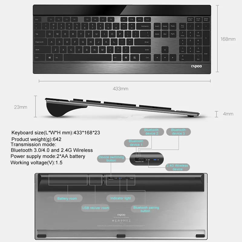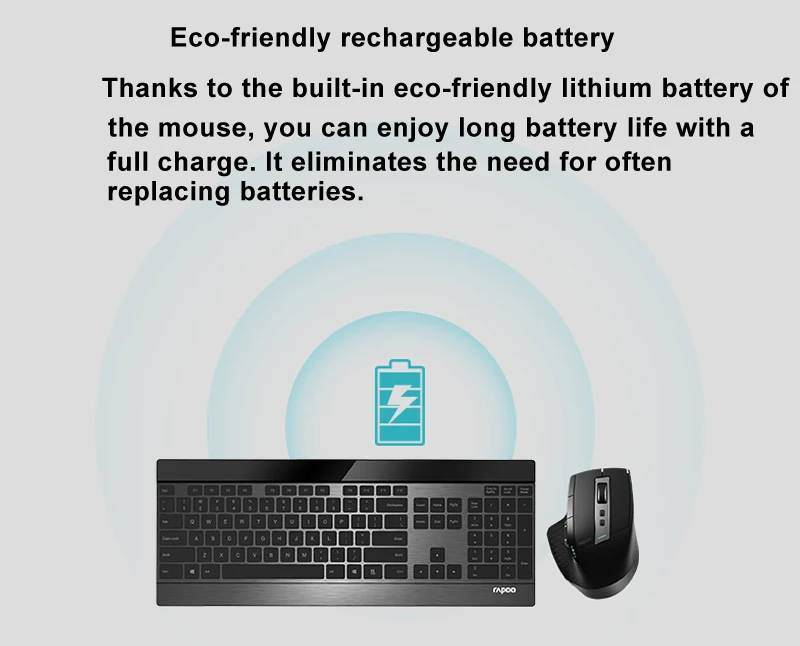 1X Rapoo MT980S многорежимная беспроводная клавиатура и мышь1xusb приемник1xmicro USB кабель для зарядки1X Руководство пользователя (батарея не входит в комплект)Примечание покупателя:В качестве строгой проверки таможней, поэтому мы открываем пломбу и извлекаем батарею. Мы упаковываем его без батареи. Если вы заботитесь об этом, пожалуйста, подумайте перед размещением заказа, большое спасибо!