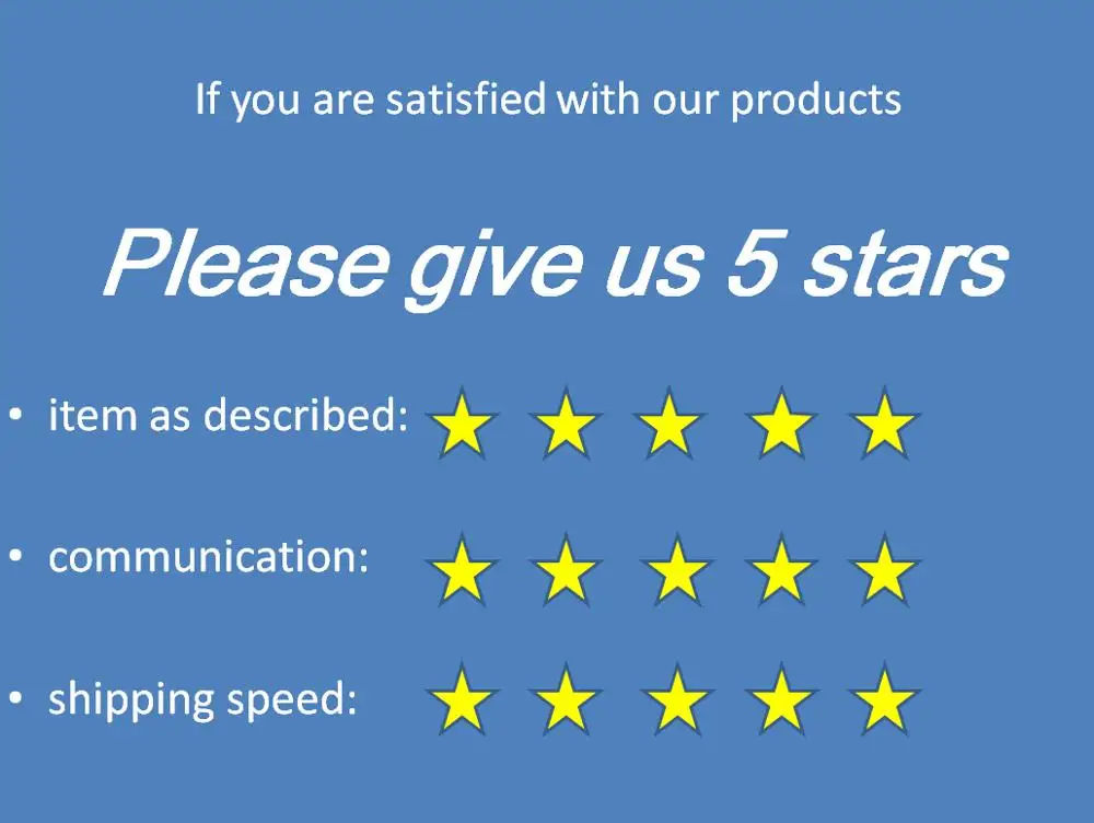 1. Ваше удовлетворение и положительные отзывы очень важны для нас. Пожалуйста, оставьте положительные отзывы и 5 звезд, если вы удовлетворены нашими товарами и услугами.2. Если у вас есть какие-либо проблемы с нашими товарами или услугами, пожалуйста, не стесняйтесь связаться с нами, прежде чем оставить отрицательный отзывы. Мы сделаем все возможное, чтобы решить любые проблемы и предоставить Вам лучшее обслуживание клиентов.3. Надеемся, что у всех вас есть хороший опыт покупок в нашем магазине и желаю всем вам хорошего дня!