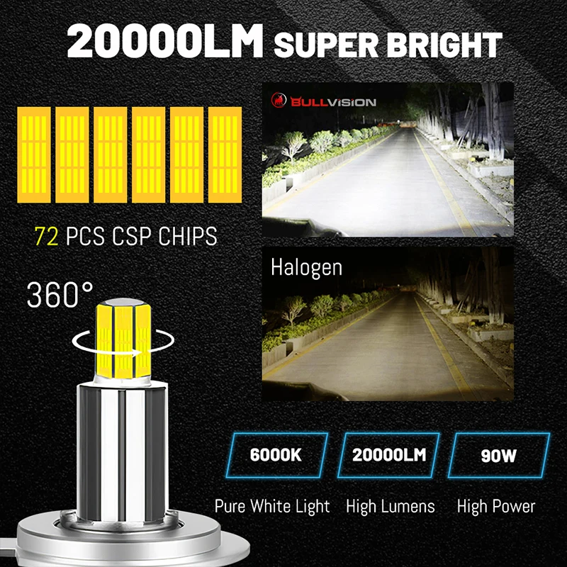 (1) светодиодная фара 20000LM/пара, каждая лампа 10000lm, супер яркая.(2) один светильник имеет 6 сторон 72 шт CSP чипы, 360 градусов светильник ing.(3) Этот продукт 6000k, чисто белый светильник.(4) Мощность этого продукта составляет 90 Вт/пара, каждая лампа-45 Вт.