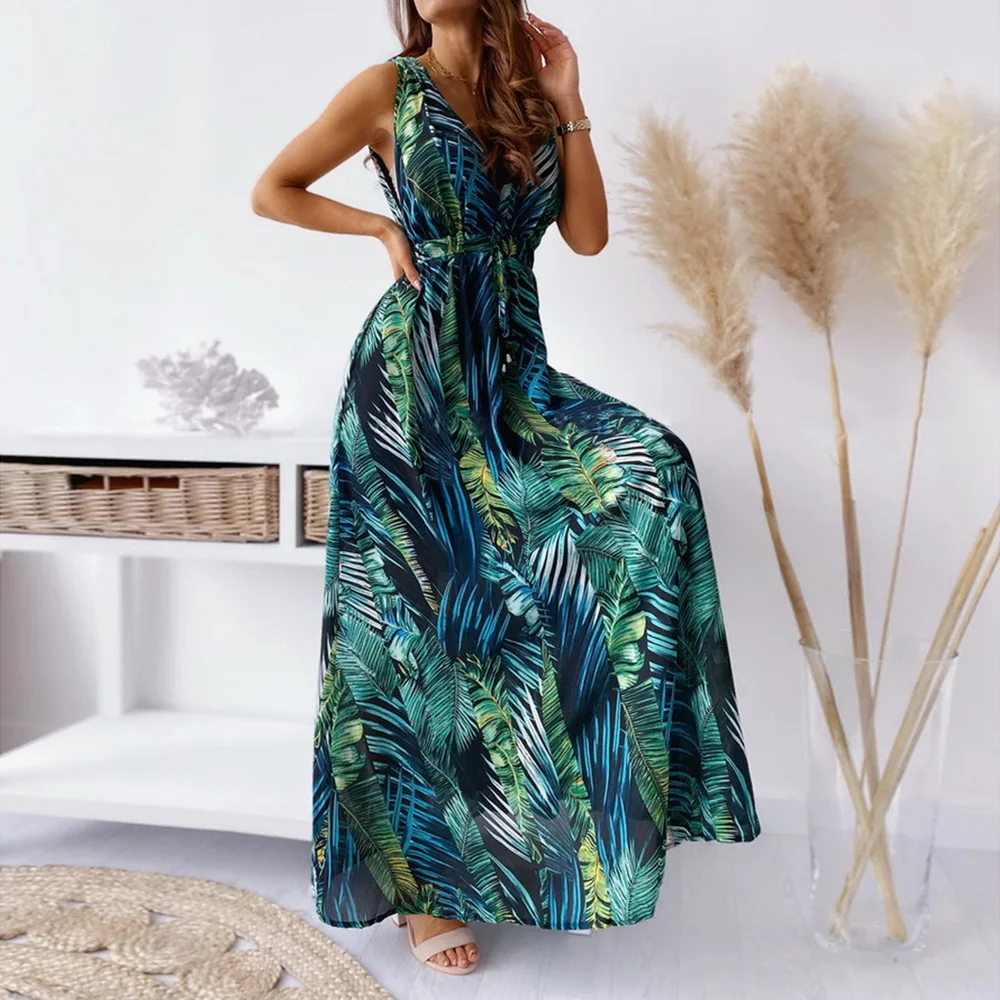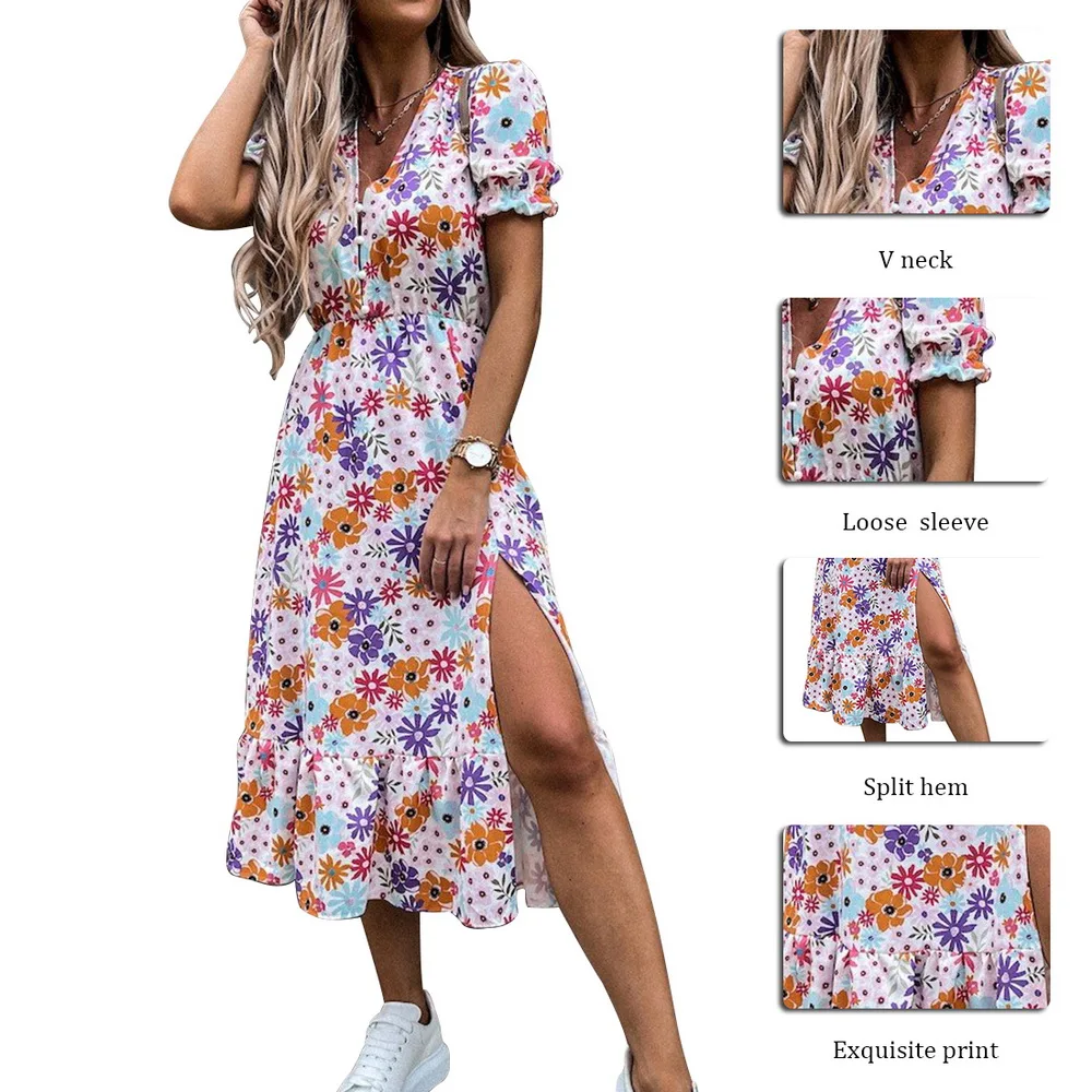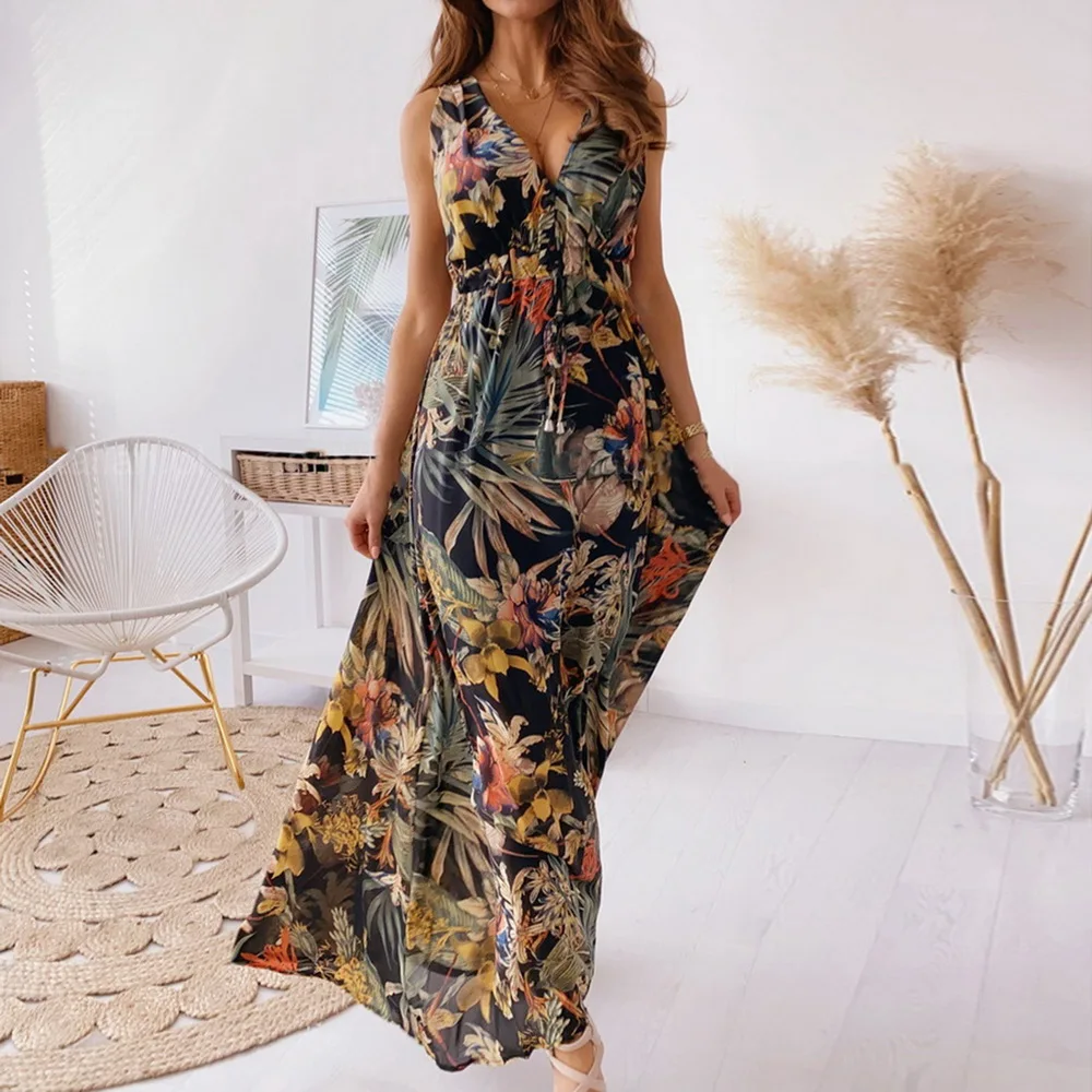 Платье женское пляжное с V-образным вырезом, повседневное винтажное богемное длинное с разрезом, пикантный длинный халат с принтом, без бретелек, на лето