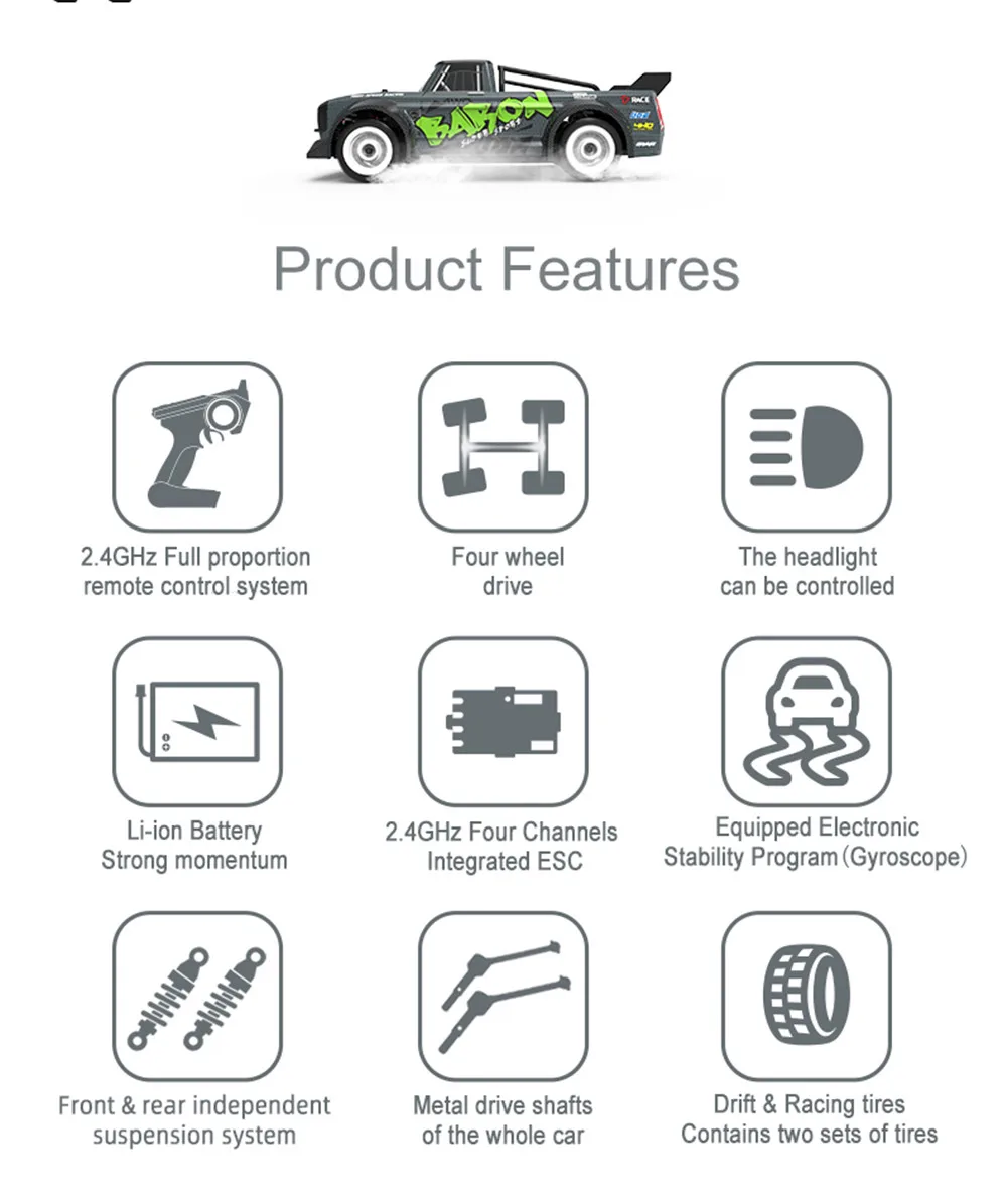 Особенности:Эта модель оснащена полномасштабными синхронными функциями управления, такими как вращение вперед, назад, влево и вправо, торможение и т. д., а также защита от перезаряда батареи и защита от перегрузки по токуEsc половинки в тех случаях, когда литиевая батарея мощность ниже, чем 6,5 V, и он будет автоматически прекращает работу в тех случаях, когда он меньше, чем 6VУправляемые фары с ангельскими глазамиESP body электронная система стабильности (гироскоп)С шариковыми подшипникамиПолноразмерная синхронная система дистанционного управления 2,4GДифференциал передачи PA, все металлические трансмиссионные вала (передняя CVD, задняя собачья кость)Ралли колеса являются стандартными, и набор Дрифт колеса могут быть заменены