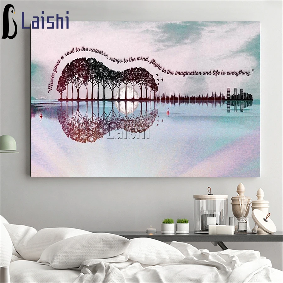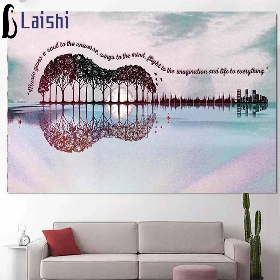 Алмазная картина сделай сам, квадратная круглая мозаика с изображением гитары, дерева, морской поверхности, вышивка крестиком, пейзаж, ручное искусство, украшение для дома