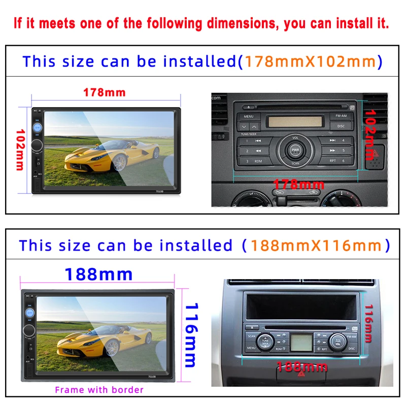 1.Пожалуйста, обратите внимание на модель и размер перед размещением заказа.2.Размеры установки моего продукта: длина 178 мм x высота 102 мм, Длина 188 мм x высота 116 мм. Если он подходит для одного из размеров, он может быть установлен. Этот размер подходит для большинства 85% старых автомобилей.3.Если у вас есть какие-либо другие вопросы, пожалуйста, свяжитесь со службой поддержки клиентов.