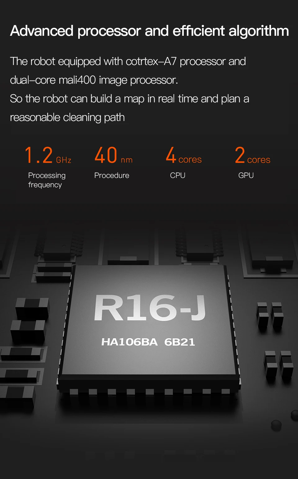Усовершенствованный процессор и эффективный алгоритмРобот оснащен процессором cotrtex-a7 и двухъядерным процессором изображений mali400