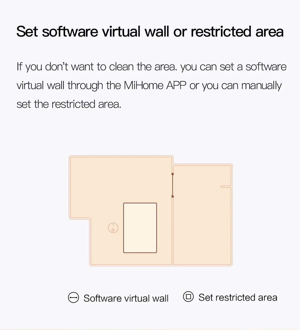 Установка виртуальной стены или ограниченной зоны программного обеспеченияЕсли вы не хотите чистить участок. Вы можете установить виртуальную стену программного обеспечения через приложение Mihome