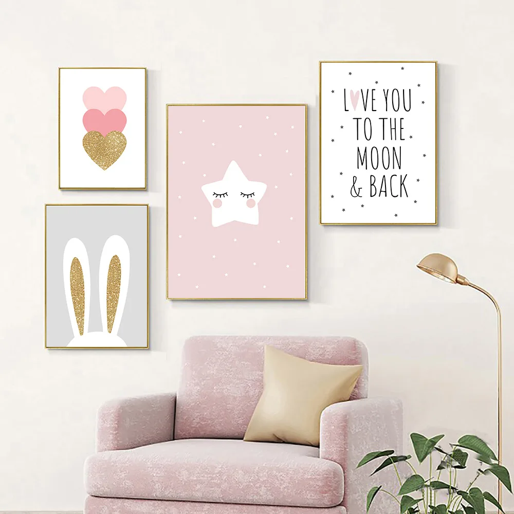 Картина на холсте для детской комнаты, постеры и принты розового золота с изображением сердец, звезд, Луны, скандинавские настенные картины для декора детской спальни