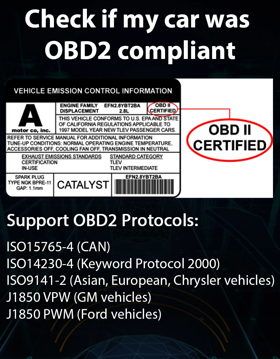 Если вы не уверены, совместим ли ваш автомобиль с протоколом OBD2, пожалуйста, посмотрите под капот и попробуйте найти ярлык, в котором четко указано, что транспортное средство предназначено для соответствия законам OBD2.В этот чехол, OBDII используется в качестве общей срок и может означать любую из следующих характеристик:OBD II (California ARB)EOBD (европейский OBD)JOBD (японская OBD)Вы также можете проконсультироваться с руководством владельца вашего автомобиля и, возможно, связаться с вашим местным дилером. Однако имейте в виду, что многие дилеры не знают разницы между OBD и OBDII.Если транспортное средство не совместимо с OBDII, вы не можете использовать этот инструмент сканирования ELM327 OBD2 для получения диагностической информации от вашего автомобиля.