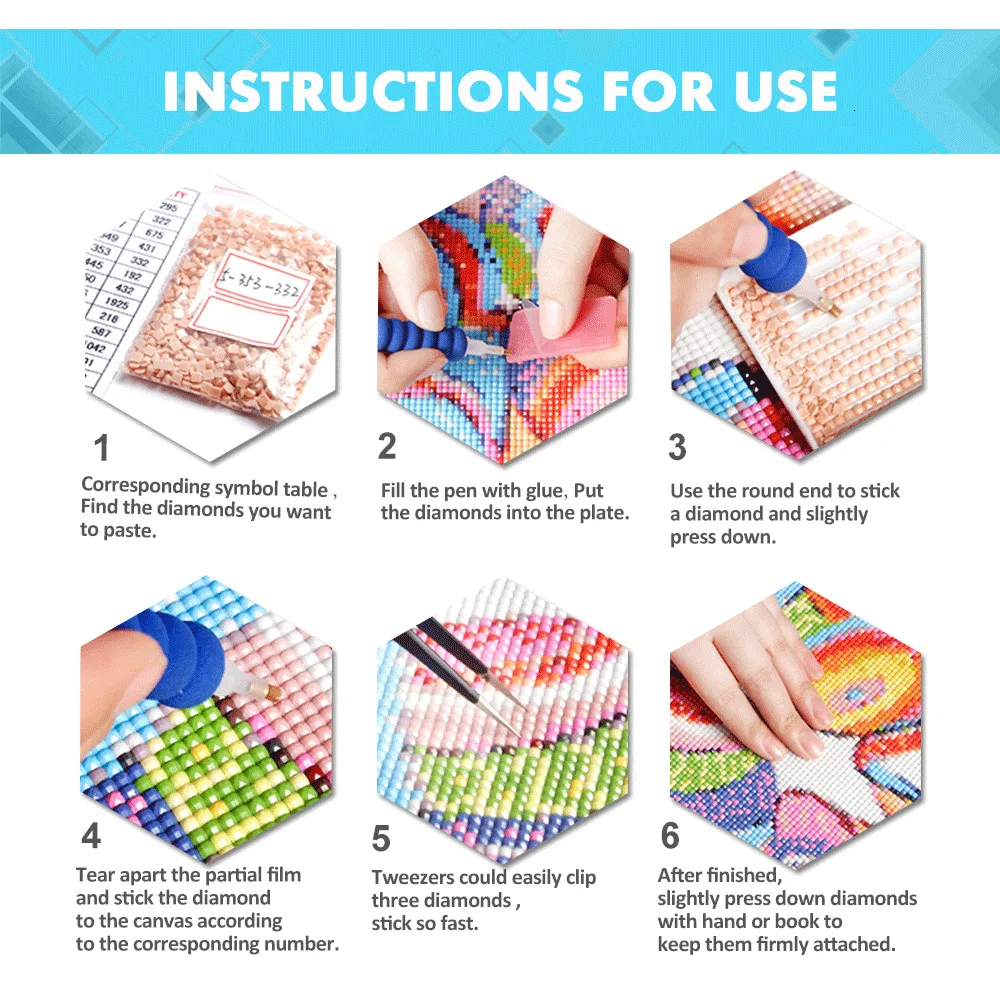 1. См. Таблицу сравнения на холсте, чтобы определить каждый номер алмаза, который соответствует области печати на холсте.2. Заполните ручку glu, поместите алмазы в тарелку.3. Используйте головку ручки, чтобы наклеить несколько алмазных сверл.4. Разорвите частичную пленку и наклейте ее на холст, указав соответствующий номер.5. Пинцет может легко закрепить три бриллианта так быстро.6. После завершения слегка прижмите бриллианты рукой или книгой, чтобы крепко прикрепить их.