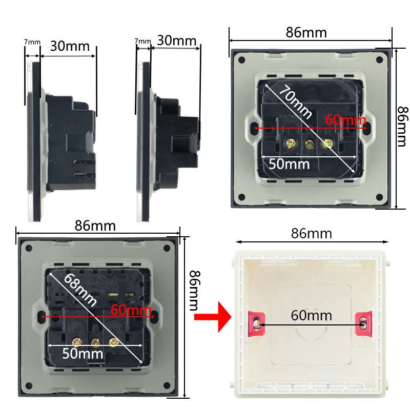 Спецификация:Тип: настенная розеткаЦвет: черный/белый/золотой/серый, серый, серебристыйМатериал панели: пластиковая панельРазмер переключателя (Д * Ш): Каждый вариант отмеченУпаковочный лист:1x розетка2x винтХарактеристики:1. Вход: 100-250 В 50/60 Гц2. Выход: 5 в 2100 мА3. Номинальное напряжение: 250 В4. Номинальный ток: 16 А5. Возможность заземления: с заземляющим контактом6. Степень защиты от поражения электрическим током: с повышенной защитойОсобенности:1. Используется для питания мобильных телефонов, цифровых продуктов или другого электрического оборудования.2. Он широко используется во многих местах, таких как гостиница, ресторан, дом, общественные места, для удобства клиентов при зарядке цифровых продуктов.
