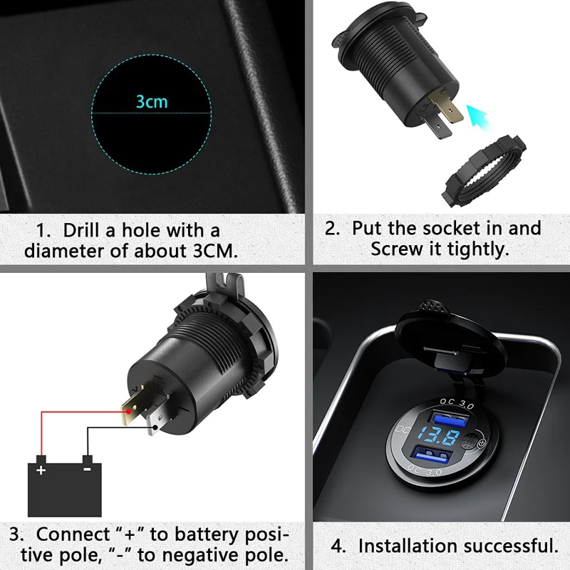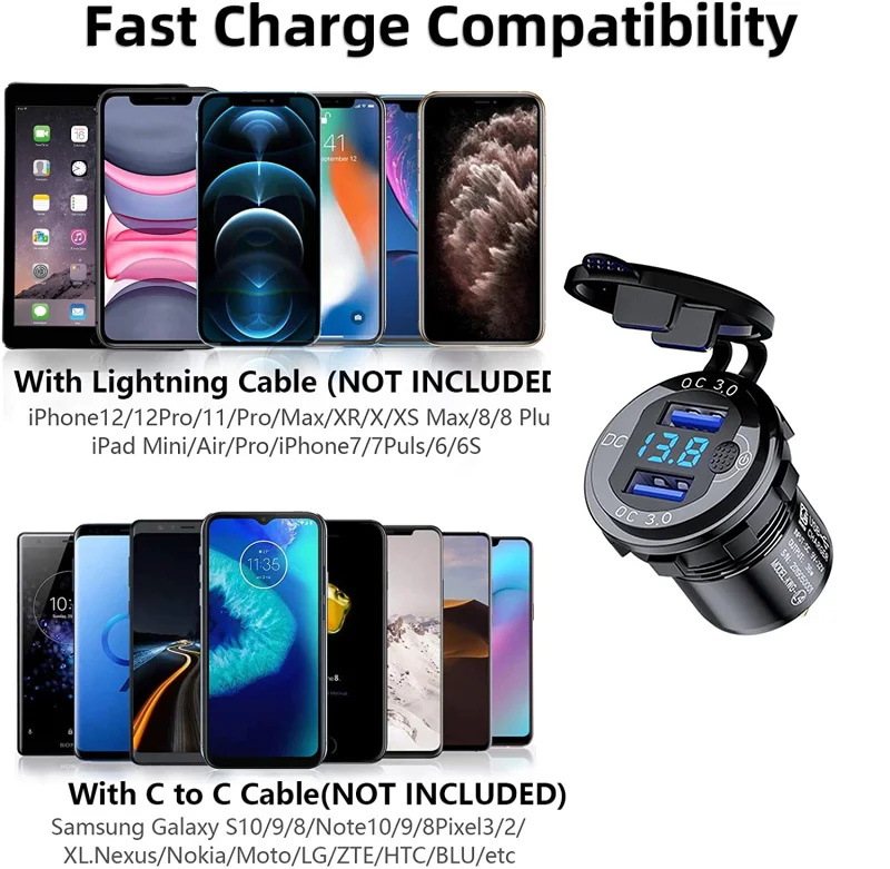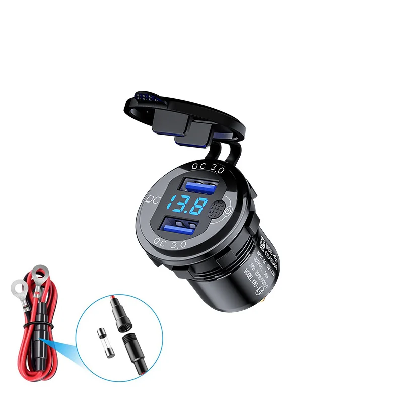 Встроенный usb-разъем зарядного устройства с светодиодный дисплеем напряжения, который может показать состояние напряжения автомобильного аккумулятора во времени. Очень полезно для автомобилей, лодок, велосипедов, внедорожников, ATV, RV автомобилей, кемперов и мотоциклов и т. Д.