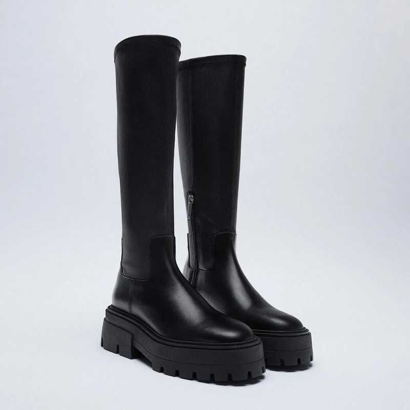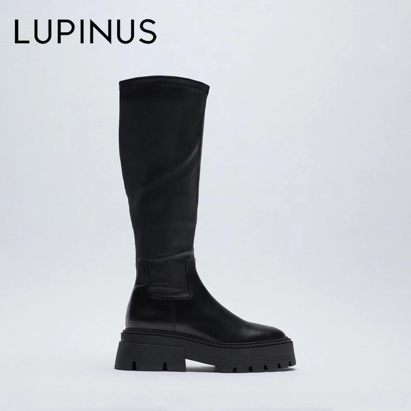 Женские высокие сапоги на платформе, черные сапоги до колена с рифл...