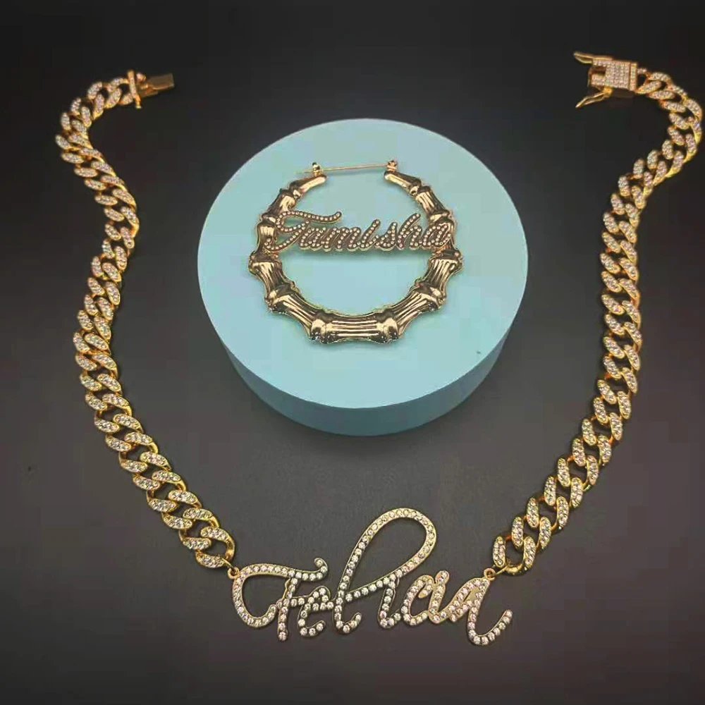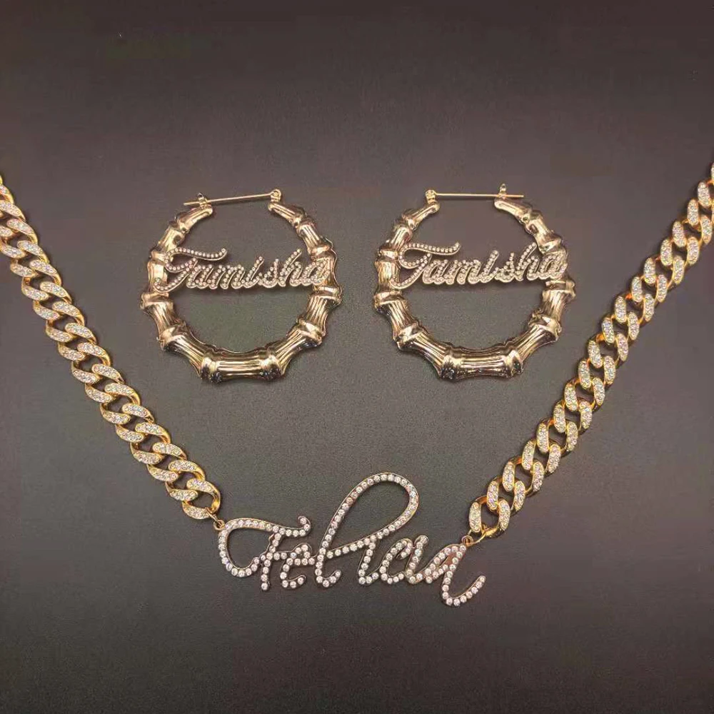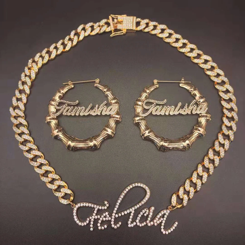 Луер настраиваемым именем серьги и ожерелье комплектиз нержавеющей стали Стразы кубинская цепь ожерелья бамбуковые обручи с буквенным принтом, высокое качество, прекрасный подарок