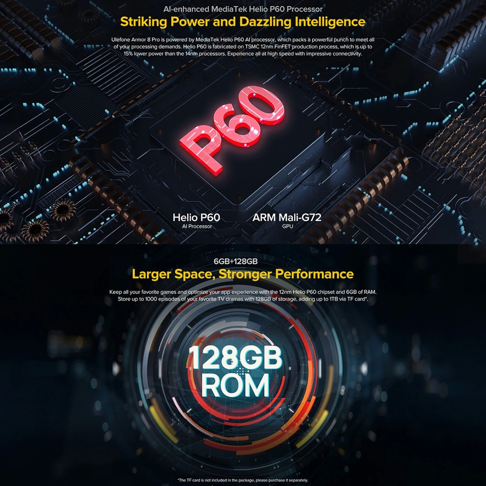 Особенности1. Helio P60 Восьмиядерный 64-разрядный до 2,0 ГГц Процессор, хорошая производительность, работает быстро и работать гладко.2. 6,1 дюймов 1560x720 пикселей, прозрачная защитная пленка, vivid цвета, хорошо подходит для просмотра видео, играть в игры.3. Всесторонняя защита на 360 градусов, прочная и долговечная в использовании.4. Уровень IP68/IP69K водонепроницаемый пыленепроницаемый ударопрочный, он может быть использован в широком использовании сценариев и приложений.5. Питание от литий-полимерного аккумулятора большой емкости 5580 мАч, длительный срок службы.Сеть1. 2G Частота сети:-GSM: B2/B3/B5/B82. 3G Частота сети:-WCDMA: B1/B2/B4/B5/B83. 4G Частота сети:-LTE-FDD: B1/B2/B3/B4/B5/B7/B8/B12/B13/B17/B18/B19/B20/B25/B26/B28A/B28B/B664. VoLTE: Можно ли использовать VoLTE, зависит от местных перевозчиков, потому что не все местные Перевозчики могут поддерживать эту функцию.