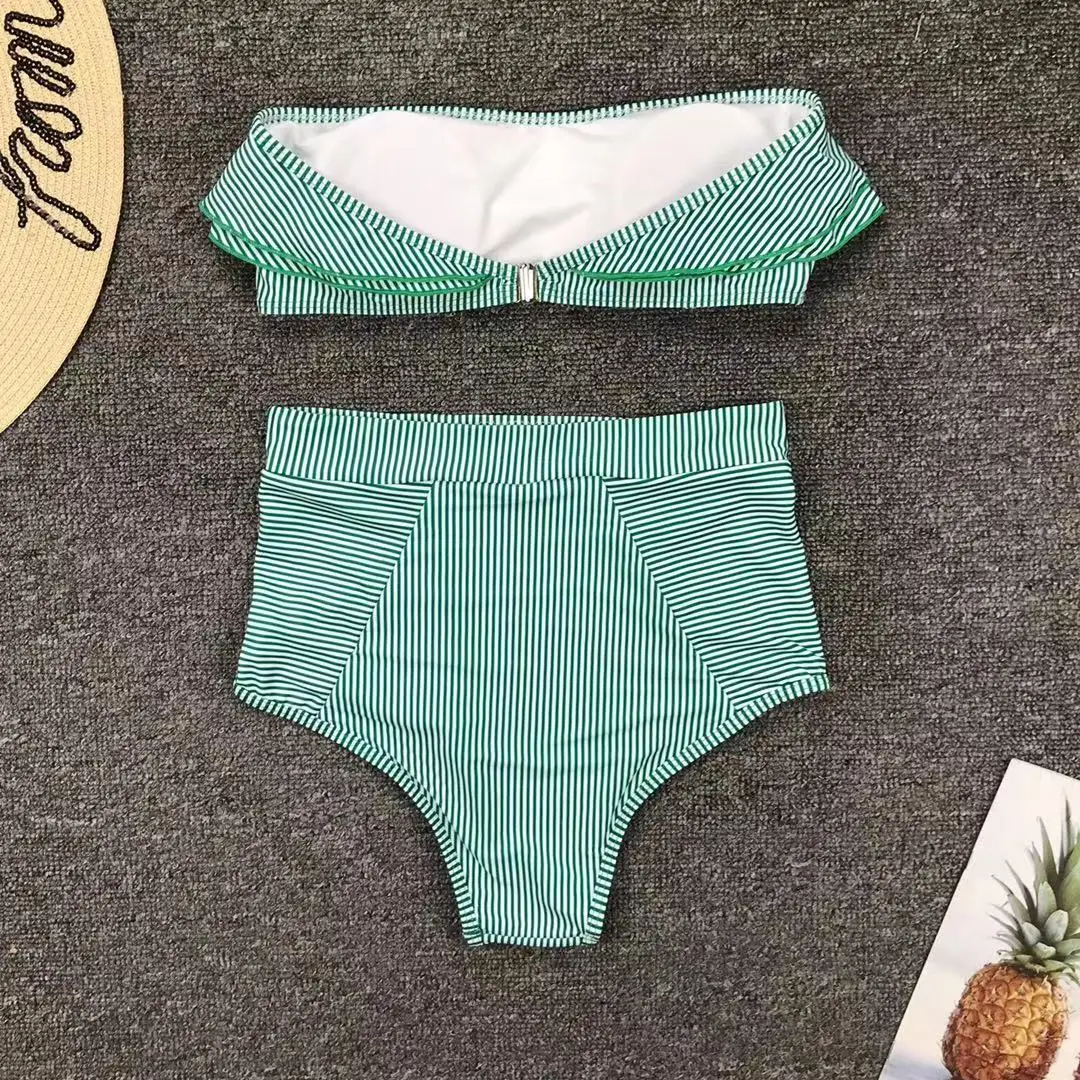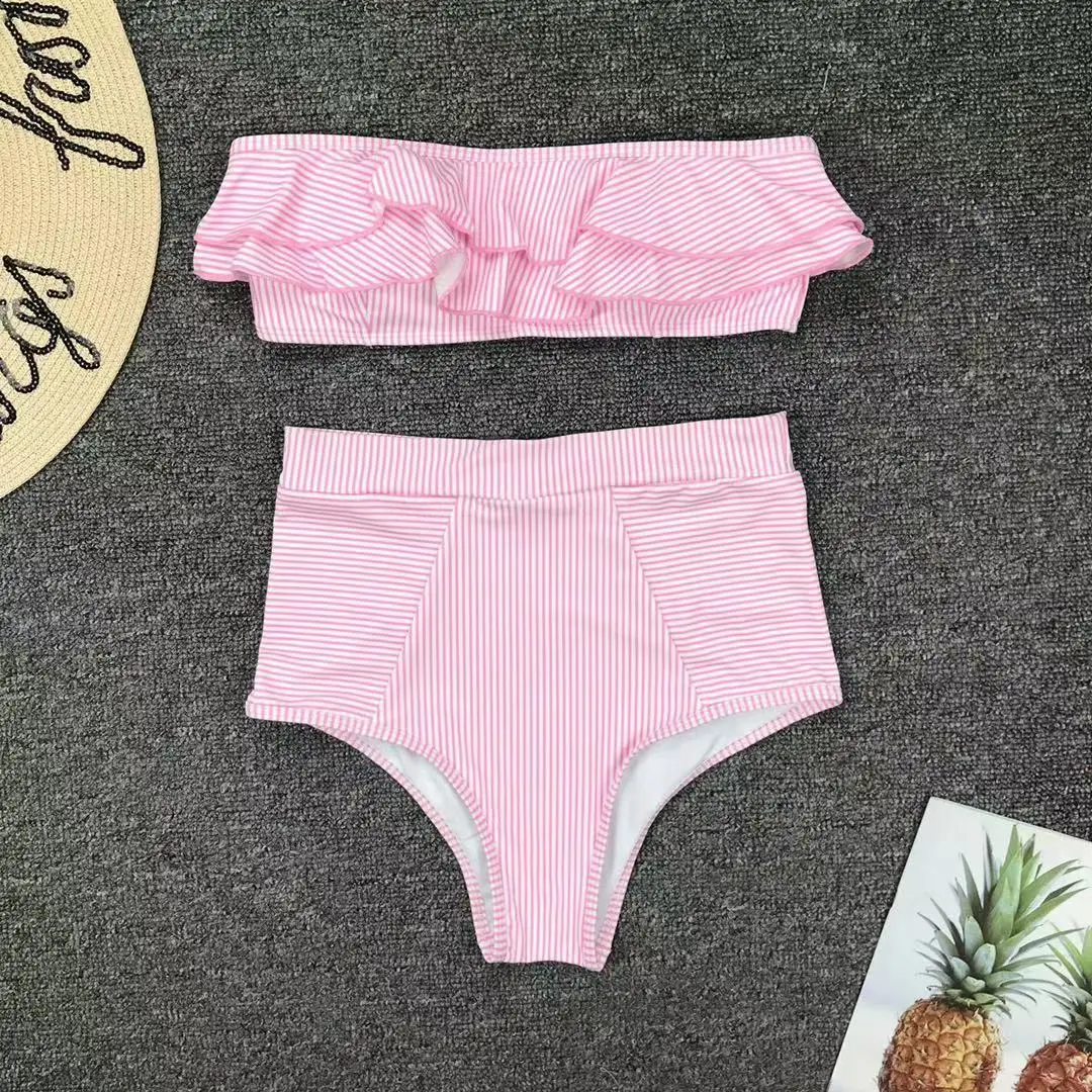 Женский раздельный купальник, асимметричный полосатый комплект бикини с оборками и высокой талией, летняя пляжная одежда