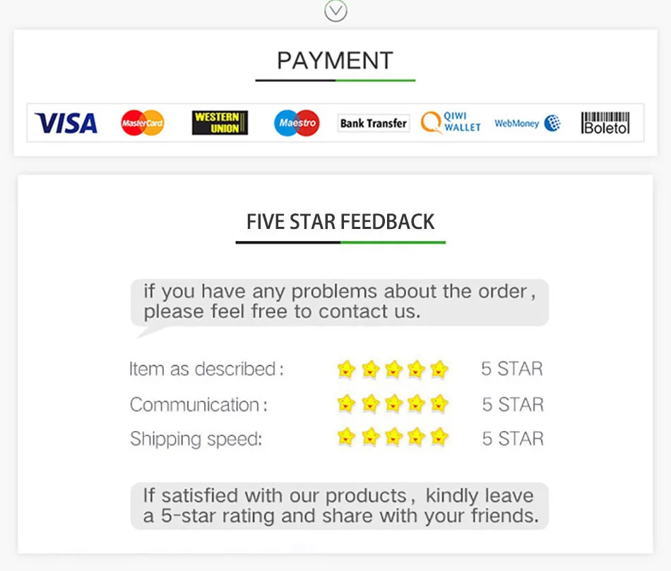 Отгрузка1. Доставка по всему миру2. Все товары тщательно проверяются перед отправкой. Мы упакуем их и отправим посылку как можно скорее. И будет небольшая задержка во время праздников.3. Пожалуйста, заполните ваше полное имя и правильный адрес, любой запрос о декларируемой стоимости для таможни, пожалуйста, сделайте отметку в заказе или свяжитесь с нами в любое время4. Если вы не можете получить товар, пожалуйста, свяжитесь со мной для получения помощиОплата1. Мы принимаем Ali pay, West Union, TT. Все основные кредитные карты принимаются через безопасный платежный процессор ESCROW.2. Вы можете оплатить с помощью Visa, Mastercard, Western Union, Qiwi и банковским переводом.3. Оплата должна быть произведена в течение 3 дней после размещения заказа.Примечания:· Фактический размер ручного измерения может иметь некоторые ошибки. Фактический размер зависит от фактического товара.· Из-за различных условий освещения и съемки цвет изображения может немного отличаться от фактического продукта. Пожалуйста, ознакомьтесь с фактическим товаром.
