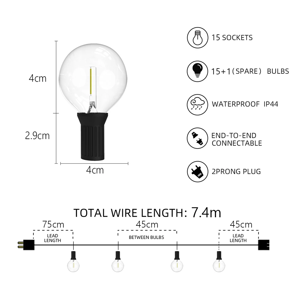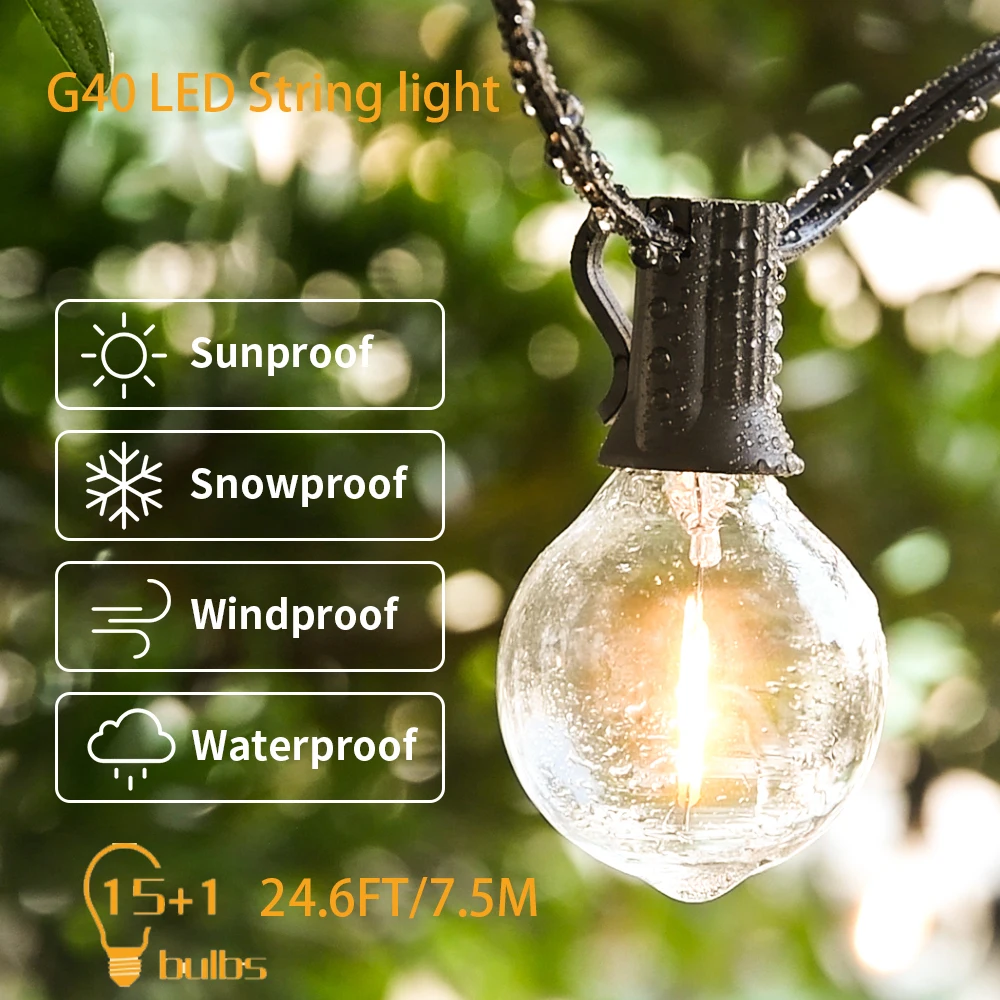 Водонепроницаемая гирлянда s 24,6 футов E12 Основа 15 + 1 G40, светодиодная сказочная Гирлянда для свадьбы, вечеринки, сада, наружного декора