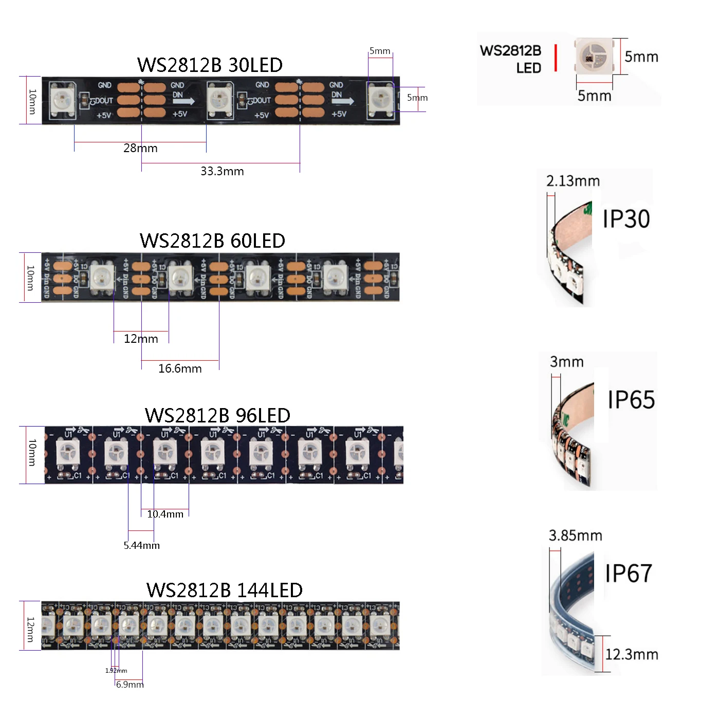 Входное напряжение: DC5VМощность: 30 светодиодов/м ---- 9 Вт/метр60 светодиодов/м ---- 18 ватт/метр74 светодиода/м ---- 22,2 Ватт/метр96 светодиодов/м ---- 28,8 Вт/метр144 светодиодов/м ---- 43,2 Вт/метрСветодиодный ресурс: WS2812B светодиодный (5050 SMD RGB светодиодный со встроенной улучшенной версией WS2811 IC)Светодиодный: Каждый светодиодный отдельно управляемый светодиодныйТип IC: улучшенная версия WS2812 IC (Встроенный светодиодный индикатор 5050SMD RGB)ИС: 1 IC дисков 1 Led чипПиксели: 30/60/74/96/144/метровШаг: 16,6 мм (1000/64)Серые Весы: 256Биты/Цвет: 8 бит/цветFPC ширина: 30 светодиодов/м ---- 10 мм60 светодиодов/м ---- 10 мм74 светодиода/м ---- 10 мм96 светодиодов/м ---- 10 мм144 светодиодов/м ---- 12 ммЦвет FPC: черный/белыйСтепень защиты: IP30/ IP65 /IP67Цвет s: полный цвет RGB, изменение цвета мечтыМожно резать: Каждый светодиодныйПосылка: в антистатическую сумку, IP30 IP65 с 3 м липкой лентой на задней части (IP67 без 3M клей)