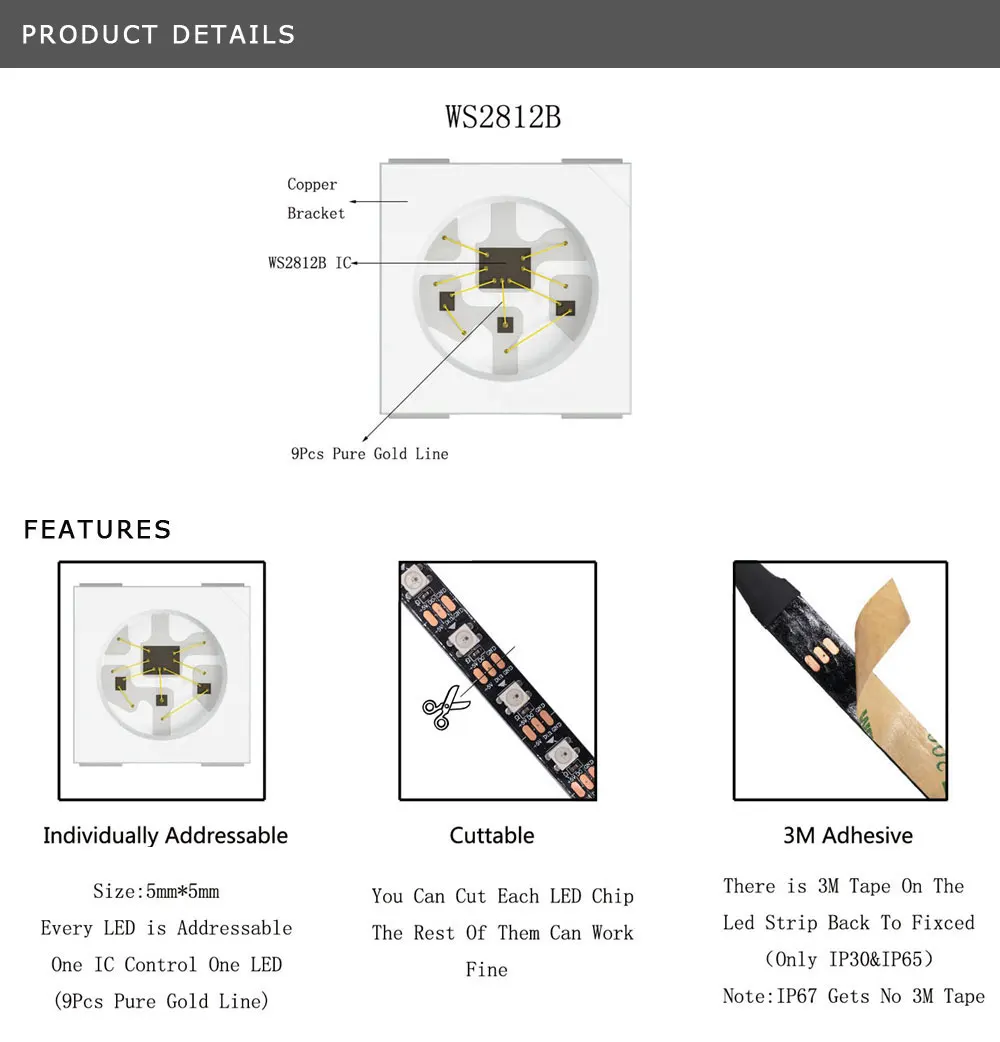 1. Светодиодная лента с помощью контактной сварки 0,5 м, это совершенно нормально в электронного продукта, это не является проблемой качества. В том случае, если вы имеете что-то против, не Оформляйте заказ!2. WS2812B Светодиодные полосы можно вырезать купить каждый "один" светодиодный чип!3. IP30: не водонепроницаемыйIP65: водонепроницаемое силиконовое покрытиеIP67: водонепроницаемый в силиконовой трубке4. WS2812B Светодиодная лента работает с DC5V, и ей нужно aWS2812B Led контроль