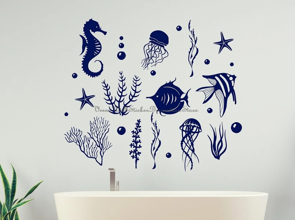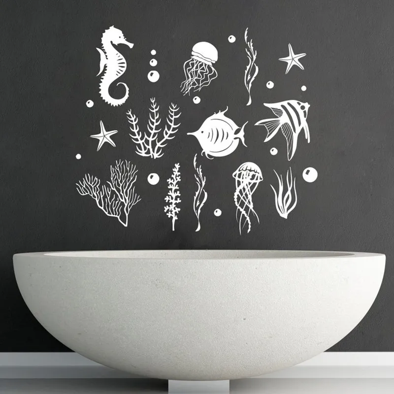 Виниловые наклейки на стену Морская жизнь, ракушки, морская Медуза, можно самостоятельно свободно наклеить, в средиземноморском стиле, украшения для ванной комнаты 12