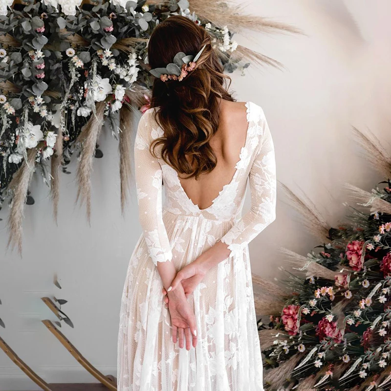 Новинка, распродажа, кружевные свадебные платья с длинным рукавом, свадебное платье с открытой спиной и вырезом под горло, свадебное платье для невесты с аппликацией и шлейфом, 2021