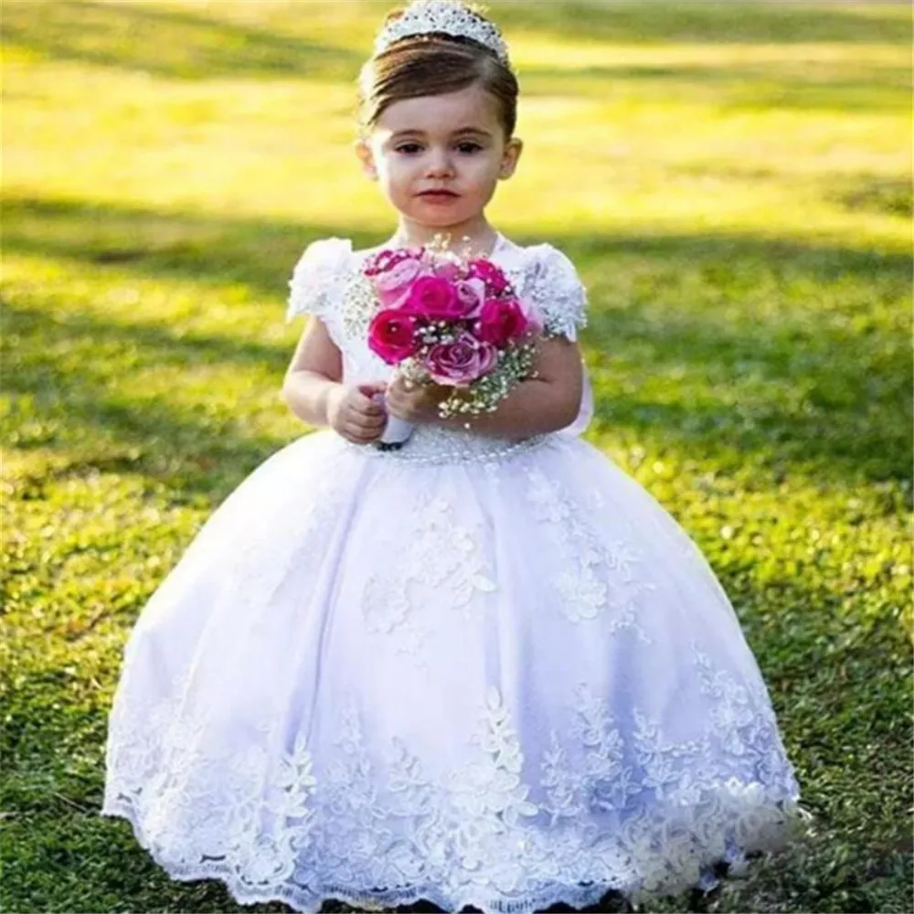 Платье для девочек с белыми цветами, кружевные аппликационные тюлевые платья до пола с открытой спиной для первого причастия, пушистые вечерние платья