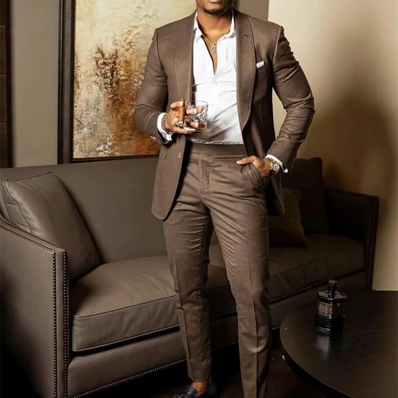 Мужские свадебные костюмы, коричневый костюм, смокинг, брюки, 2 предмета, для жениха, зауженный крой, шаль, отворот, одна пуговица, выпускной, вечерние, Блейзер, костюм, Homme