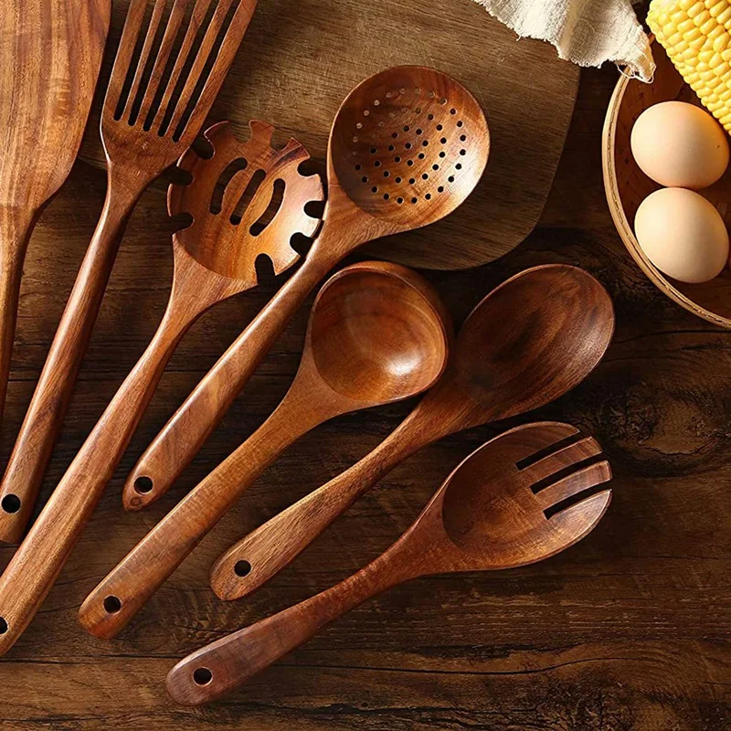 Набор деревянной кухонной утвари, деревянные ложки для приготовления пищи, натуральное тиковое дерево, набор кухонных шпателей для 7 упаковок