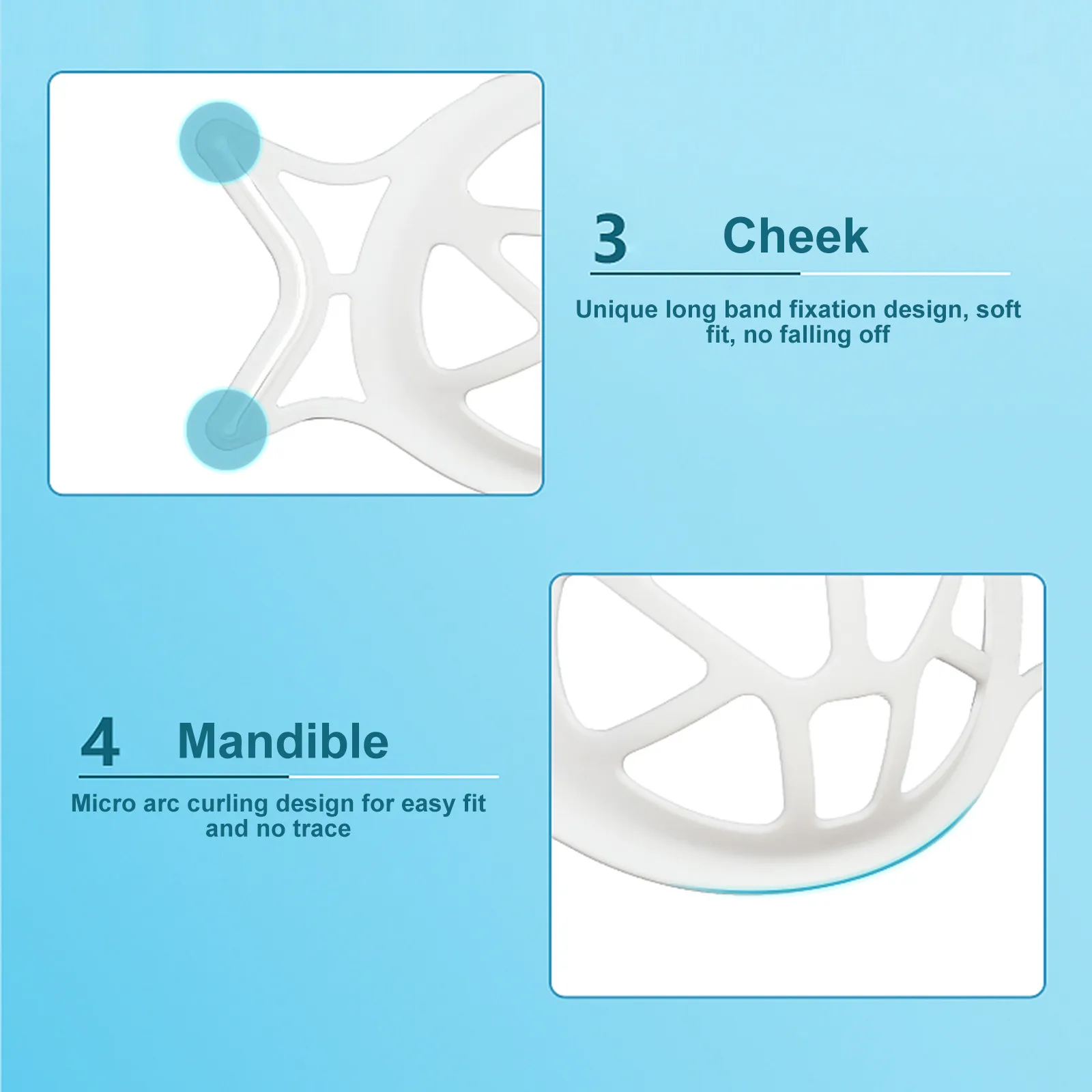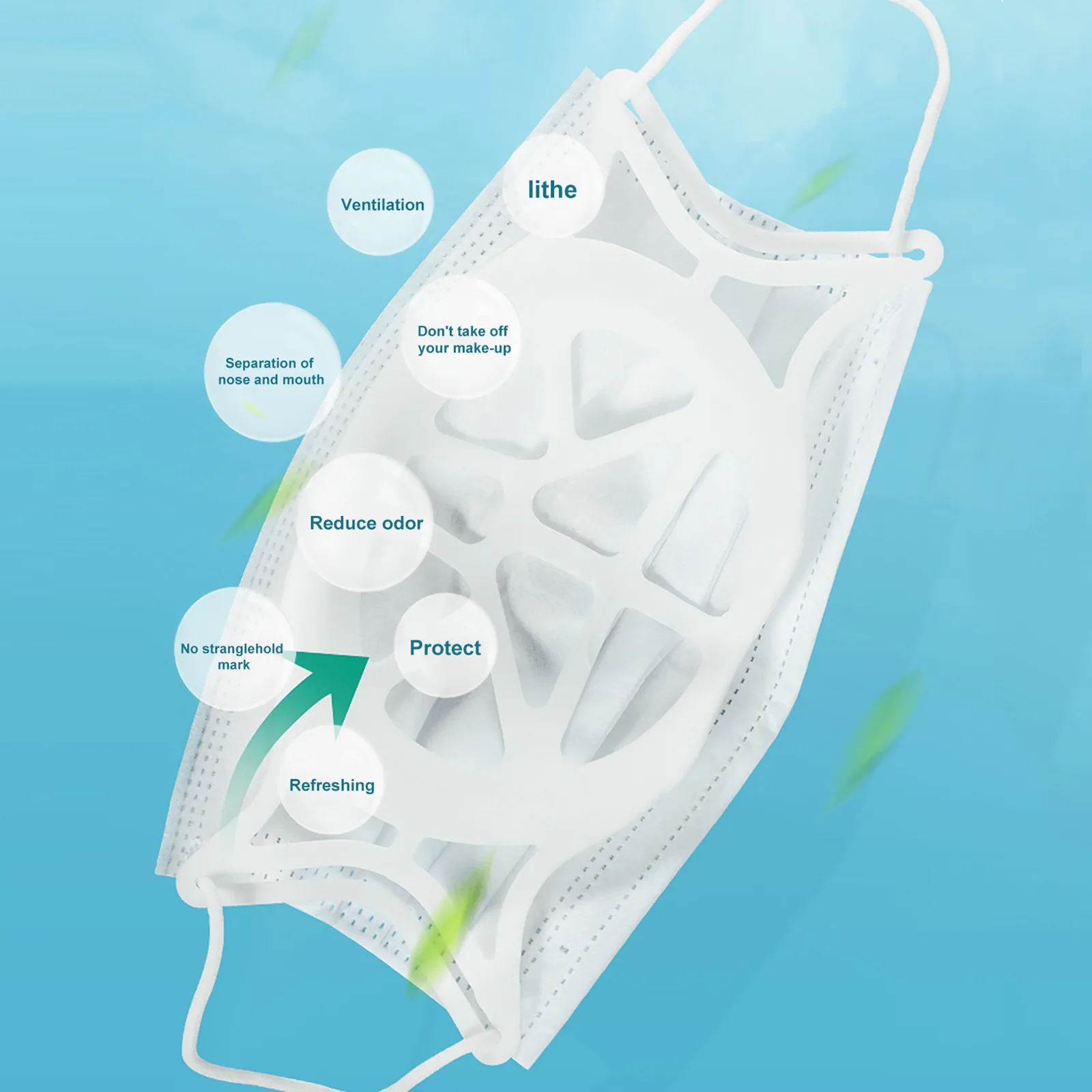 Опорный кронштейн для лицевой рамы изготовлен из TPE материала, мягкий, гладкий и удобный, моющийся и многоразовый. Уникальный носимый дизайн, мягкая посадка лица, не отвалится. Кронштейн удерживает ткань вокруг рта, чтобы создать больше пространства. Защищает женский макияж, не прилипает губная помада.