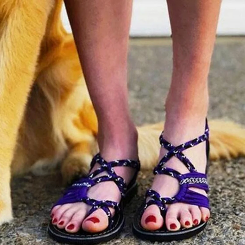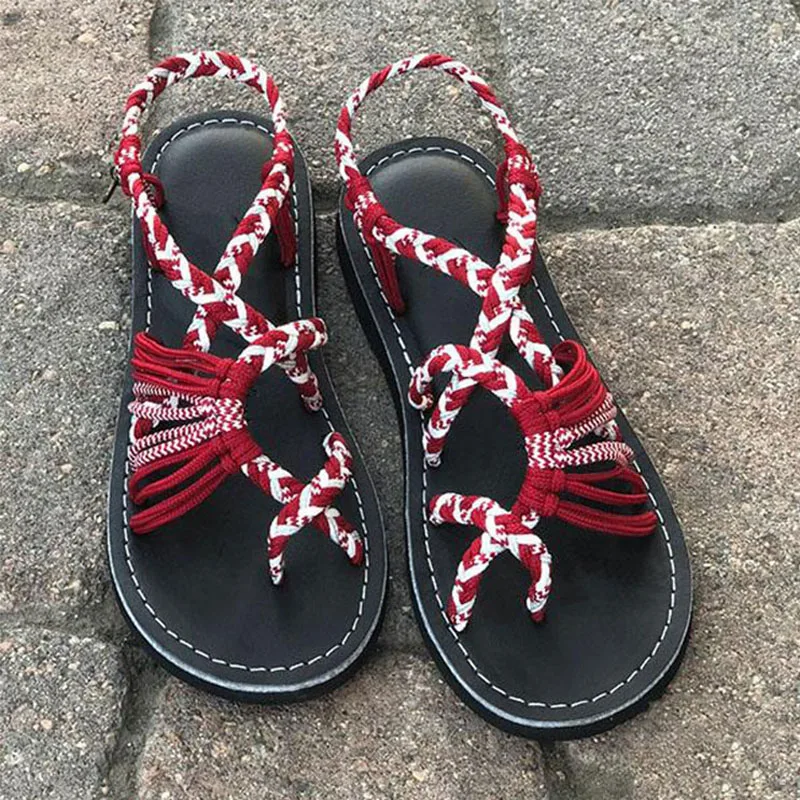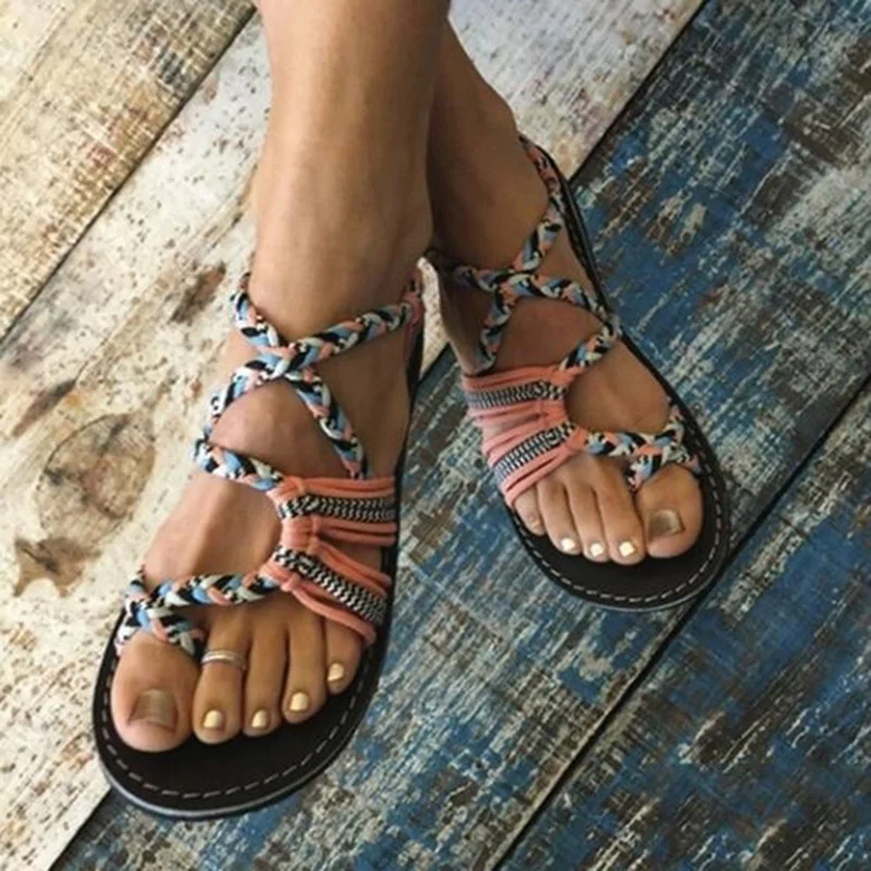Сандалии женские на плоской подошве, повседневные шлепанцы с плетеным ремешком, без застежки, летняя обувь