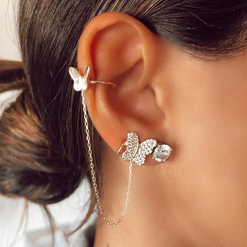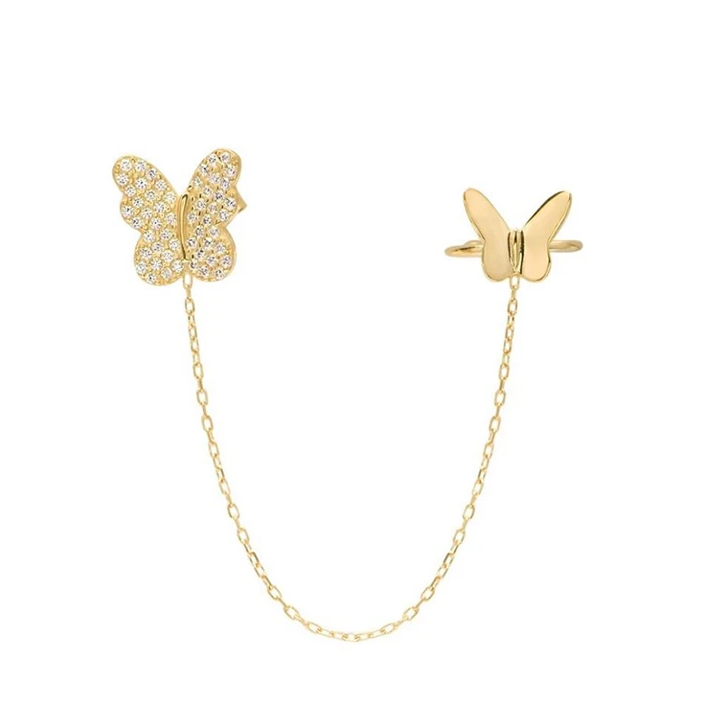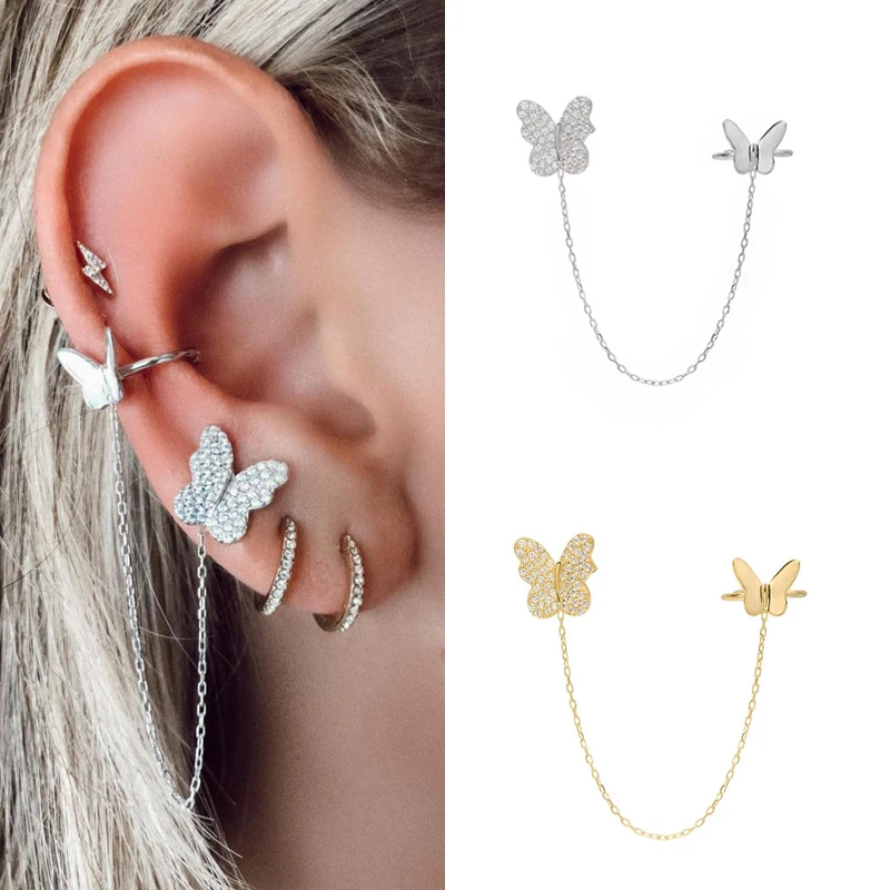 Потрясающие 18K, покрыто золотом, кубический циркон корейские сережки-шпильки ins в стиле хип-хоп с бабочками CZ цепь манжеты Серьги для женщин, модный подарок