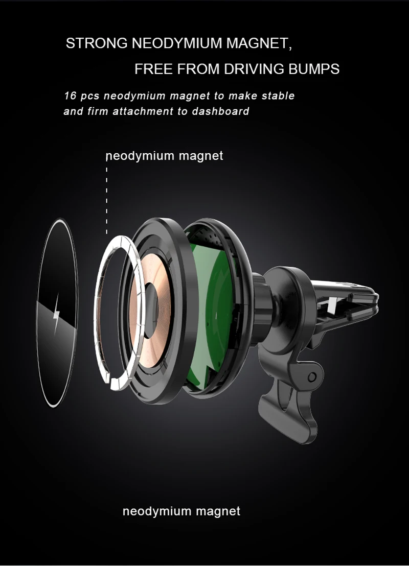 Магниты слабые. Samsung S10 с чехлом, в котором стоит металлическая пластина для магнитных держателей еле держится, при малейшей тряске падает. Если наклеить металл на чехол, то держаться будет нормально, но и металлического кольца нет в комплекте. придётся искать. зарядка работает нормально