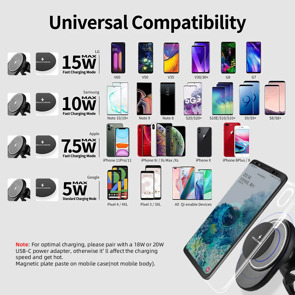 Все ровно как в описании, заряжает без проблем. В комплекте метровый type-c кабель. Из минусов, 1. через чехол не держит, пришлось клеить магнитную пластинку на чехол, но так у большинства magsafe совместимых зарядок. Но даже со стикером держит слабо, хотя смартфон еще ни разу не упал. 2. сам магнитный стикер с рисунком на любителя и довольно толстый, пришлось заказать просто черные металлические кольца, надеюсь с ними будет держаться. 3. слегка выпирает от воздуховода, предыдущий у меня был практически на решетке и по сравнению с ним чувствуется, хотя вопрос буквально пары сантиметров, с другой стороны крепление под универсальный зажимной шарик, так что можно крепить где угодно.