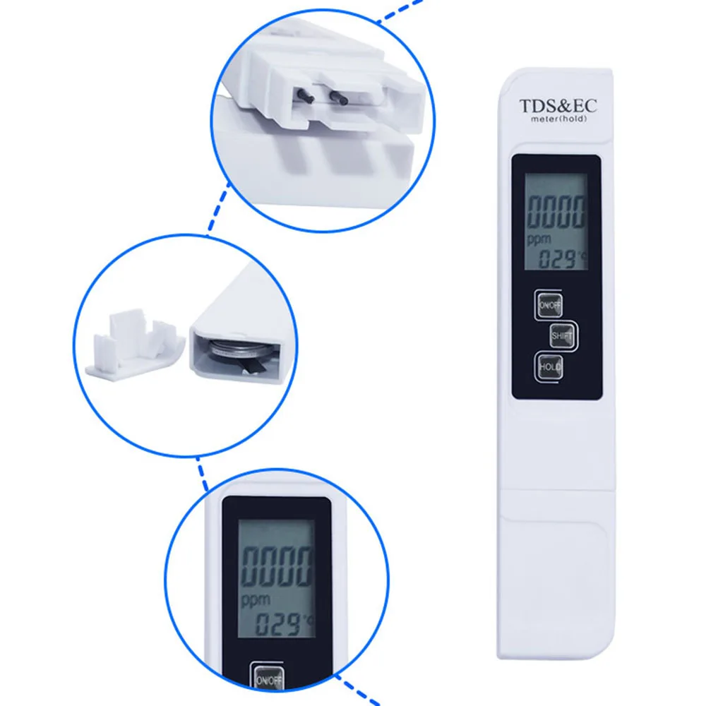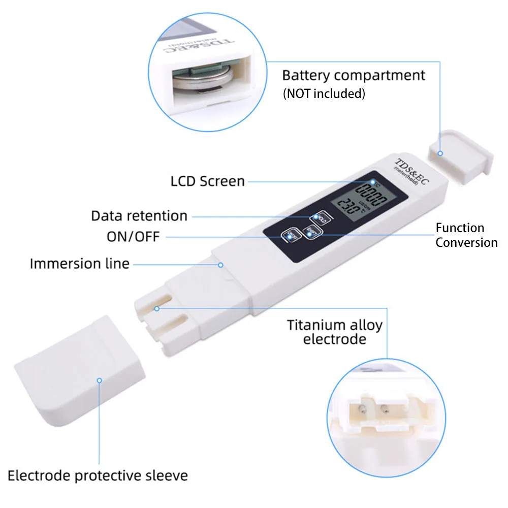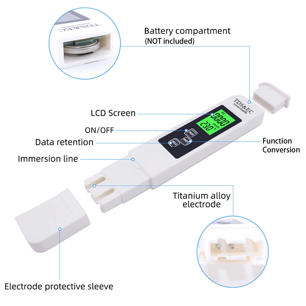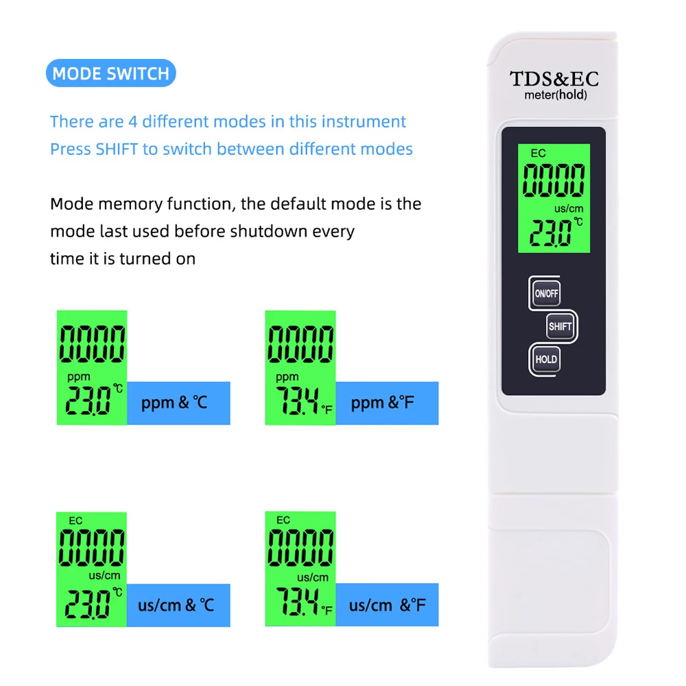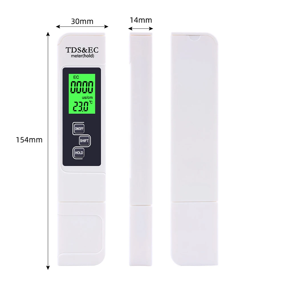Профессиональный измеритель качества воды в сочетании с измерителем TDS, измерителем EC и измерителем температуры. С помощью этого тестера TDS вы можете в любое время проверить Фильтрацию Воды, гарантируя, что вы и ваша семья не будете подвержены воздействию негигиеничной питьевой воды. Универсальный инструмент, экономящий ваши деньги и обеспечивающий лучшее для вашего здоровья. Особенности:Профессиональный, точный и точный измеритель температуры воды 3-в-1 TDS, EC и.Цифровой TDS-измеритель 3-в-1 обеспечивает точные показания TDS (общего количества растворенных твердых веществ), EC (электропроводности) и температуры.Измеритель TDS имеет автоматическую температурную компенсацию в режиме измерения.9 минут без работы, счетчик автоматически отключится. Экономия энергии, продление срока службы батареи.TDS/EC измеритель включает в себя в общей сложности 4 различных режима, нажмите кнопку SHIFT, чтобы преобразовать между различными режимами.Большой, легко читаемый ЖК-экран и функция хранения данных делают чтение и запись оснасткой.Время измерения быстрое из-за изысканных датчиков невооруженного типа, 5 секунд завершения.TDS meter-это профессиональный инструмент для тестирования уровня воды, Управление простое, модный внешний вид, небольшой размер и легко помещается в карман.Широко используется во всех испытаниях качества воды, применениях для очистки воды, регулирования сточных вод, Аква-культуры, гидропоники, лабораторных и научных испытаний, бассейнов, экологических испытаний, коллоидного серебра, обработки воды и многого другого. Характеристики:Тип: без подсветки/с подсветкой (опционально)Диапазон измерения: 0-9999Точность: ± 5%4 режима отображения:TDS: ppm & °CTDS: ppm и °FEC: μs/cm & °CEC: μs/cm & °FИсточник питания: 1*3 в CR2032 батарейка (не входит в комплект)Размер изделия: 154*30*14 мм/6,06*1,18 * дюймаВес изделия: 55 г/1,94 унцииВес посылка: 62 г/2,19 унцииПосылка: 16*4*3 см/6,30*1,57 * 1.18in Упаковочный лист:1 * тестер1 * сумка1 * Руководство (на английском языке)