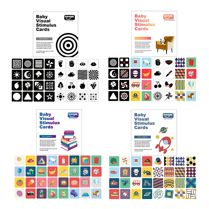 Двухсторонние и большие карты изготовлены из плотного картона и представляют контрастные иллюстрации, основанные на видении ребенка.