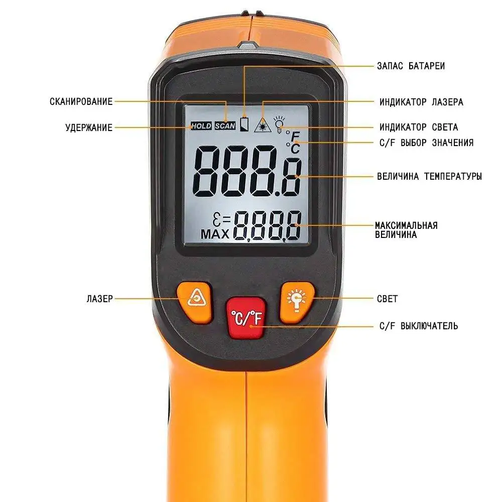В данном электронном термометре использован принцип работы, который заключается в принятии инфракрасного излучения и дальнейшее его преобразование в электрический сигнал. Оснащение пирометра жидкокристаллическим дисплеем позволяет отчетливо видеть показатели измерений даже при плохом освещении.