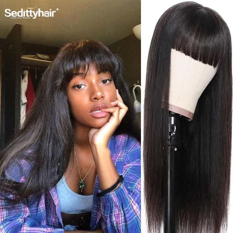 Seditty прямые человеческие волосы парики с челкой 30 дюймов парик с бахромой натуральные черные человеческие волосы парики дешевые бразильские парики без повреждений