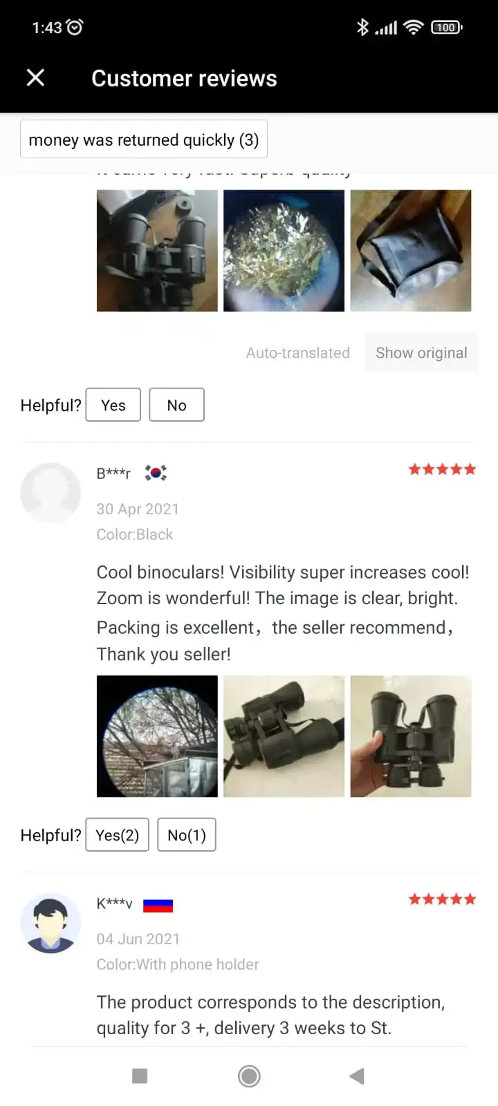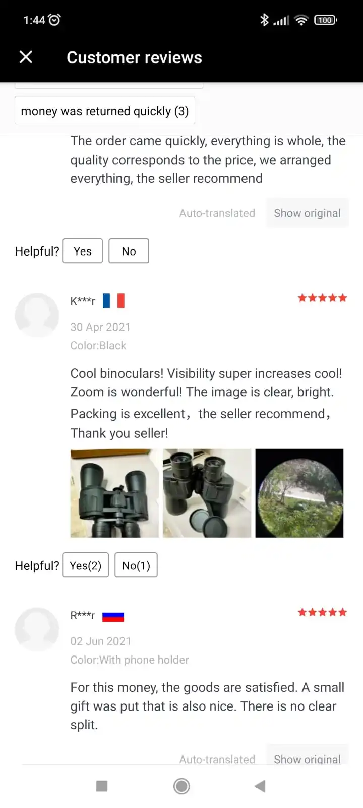 В описании указано, что увеличение составляет 20X, что неверно. Увеличится только на 3, как вы можете видеть на прилагаемом изображении. Поэтому это детская игрушка, а не профессиональный бинокль. Поверьте, я опытный охотник, и я знаю, как выглядит Увеличение 20x. Большинство отзывов являются поддельными, все они на странном английском и выглядят очень похожими, с такими словами, как «выход» и т. д. есть даже идентичные Комментарии из Кореи и Франции (см. Фото прилагается). На английском, что очень необычно для этих стран. Я попробовал открыть спор, но продавец и aliexpress отказались от частичного возврата денег.