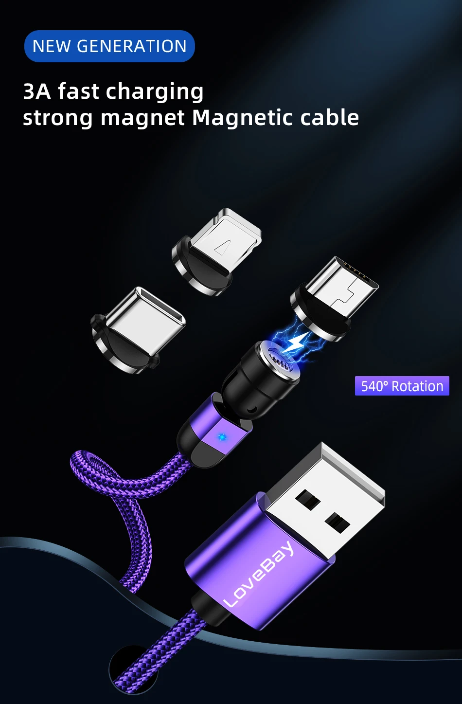 Магнитный кабель Micro USB LOVEBAY 540 для iPhone 12 Xiaomi 3A, провод для быстрой зарядки и передачи данных, магнитное зарядное устройство USB Type C, телефонный кабель