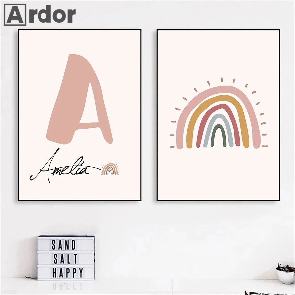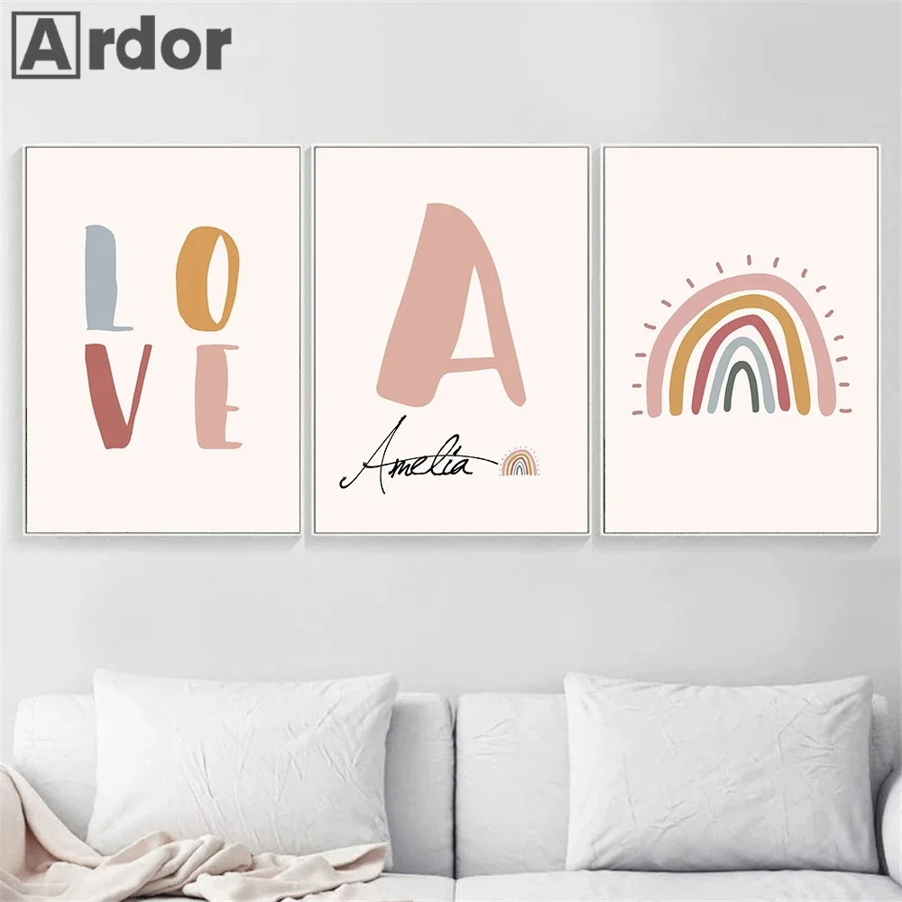 Картина на холсте с именем на заказ для маленьких девочек, детская Радужная Настенная картина, плакат с надписью Love, настенные картины в скандинавском стиле для украшения комнаты для девочек