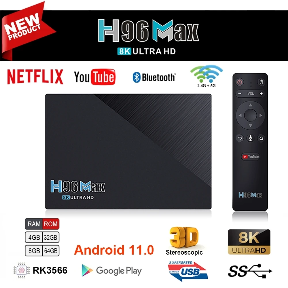 Приставка Смарт-ТВ H96 Max RK3566, Android 11,0, 8K, RK3566, двойной Wi-Fi, 2,4 ГГц5,8 ГГц, 8 ГБ, 32 ГБ, 64 ГБ, медиаплеер Google, Youtube