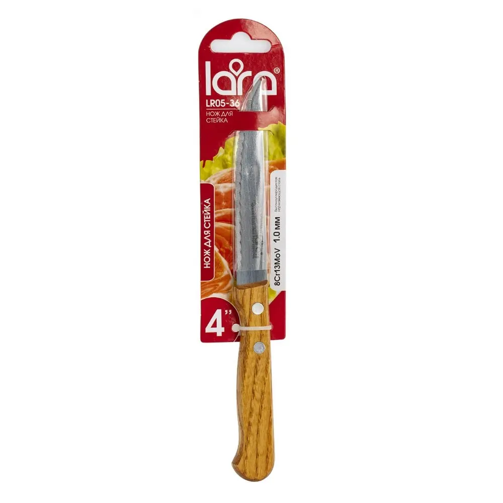 Если Вы ищете нож для ежедневного использования, который неприхотлив в обслуживани, то нож для стейков LARA с серрейторной заточкой лезвия это отличное решение, которое позволит без проблем справится с только что приготовленным стейком любой степени прожарки. Устойчив к коррозии. Клинок выполнен из высокоуглеродистой нержавеющей стали марки 3Cr13 с зеркальной полировкой. Лезвие устойчиво к коррозии, а идеальная заточка режущей кромки долгое время остаётся острой. Лёгкая заточка при помощи мусата, точильного камня или ножеточки. Удобная износостойкая ручка из натуральной древесины бука усилена заклёпками и устойчива к влаге. Только ручная мойка.