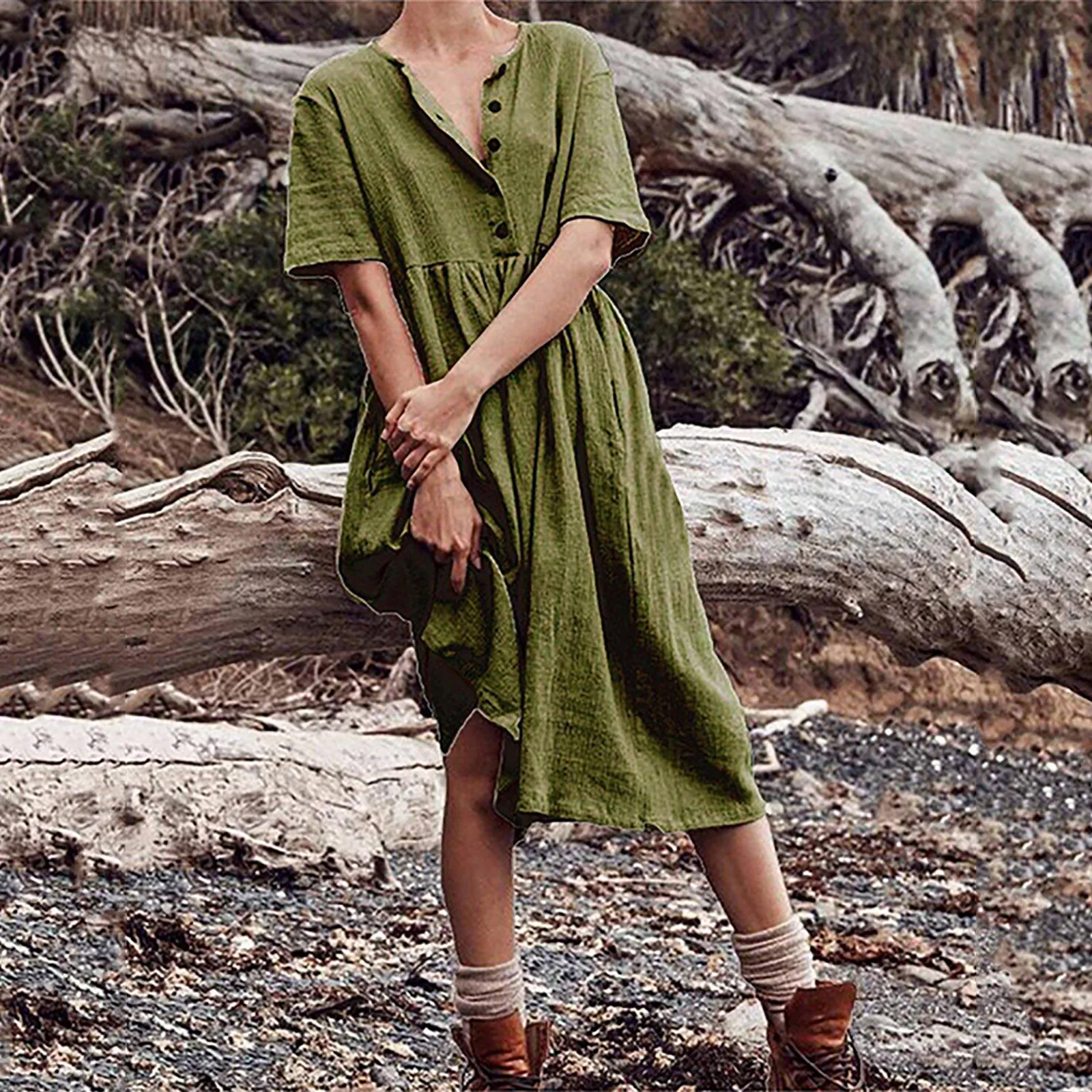 Женское однотонное легкое платье из хлопка и льна с круглым вырезом и пуговицами