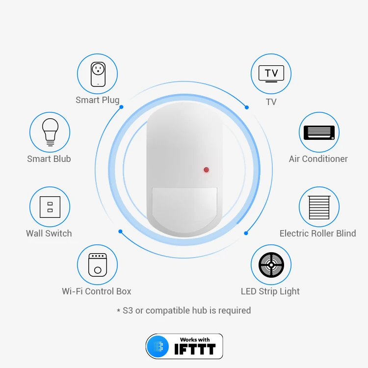 ИК-датчик движения BroadLink (требуется концентратор S3) активировать сцены и контролировать устройства при обнаружении движения Поддержка запуска со всеми BroadLink и продуктов «работает с ifttt» Push-уведомление для несанкционированных записей сменная батарея с уведомлением о низком заряде батареи mini или RM4 pro)