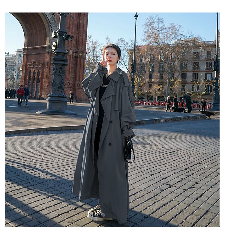Женский двубортный плащ с поясом, Свободный плащ-ветровка большого размера в Корейском стиле, верхняя одежда серого цвета, весна-осень