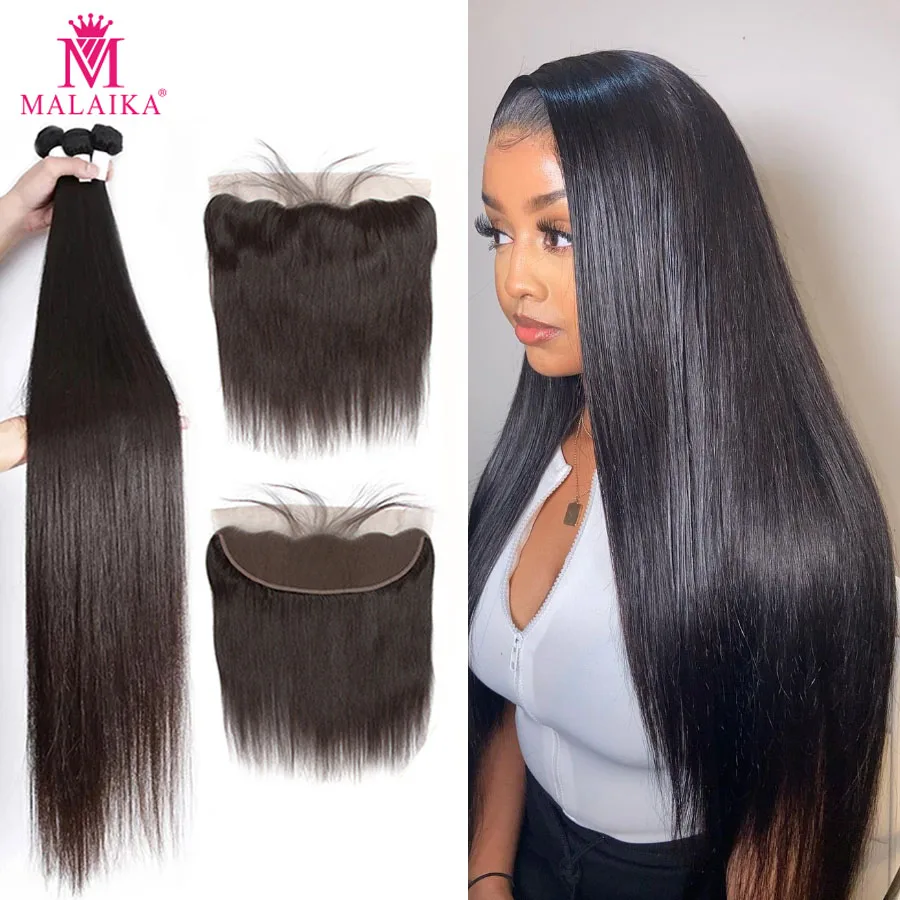 Malaika 1 3 4 бразильские волосы плетенные пучки с фронтальной 30 32 34 36 прямые человеческие волосы 13x4 кружевные пряди